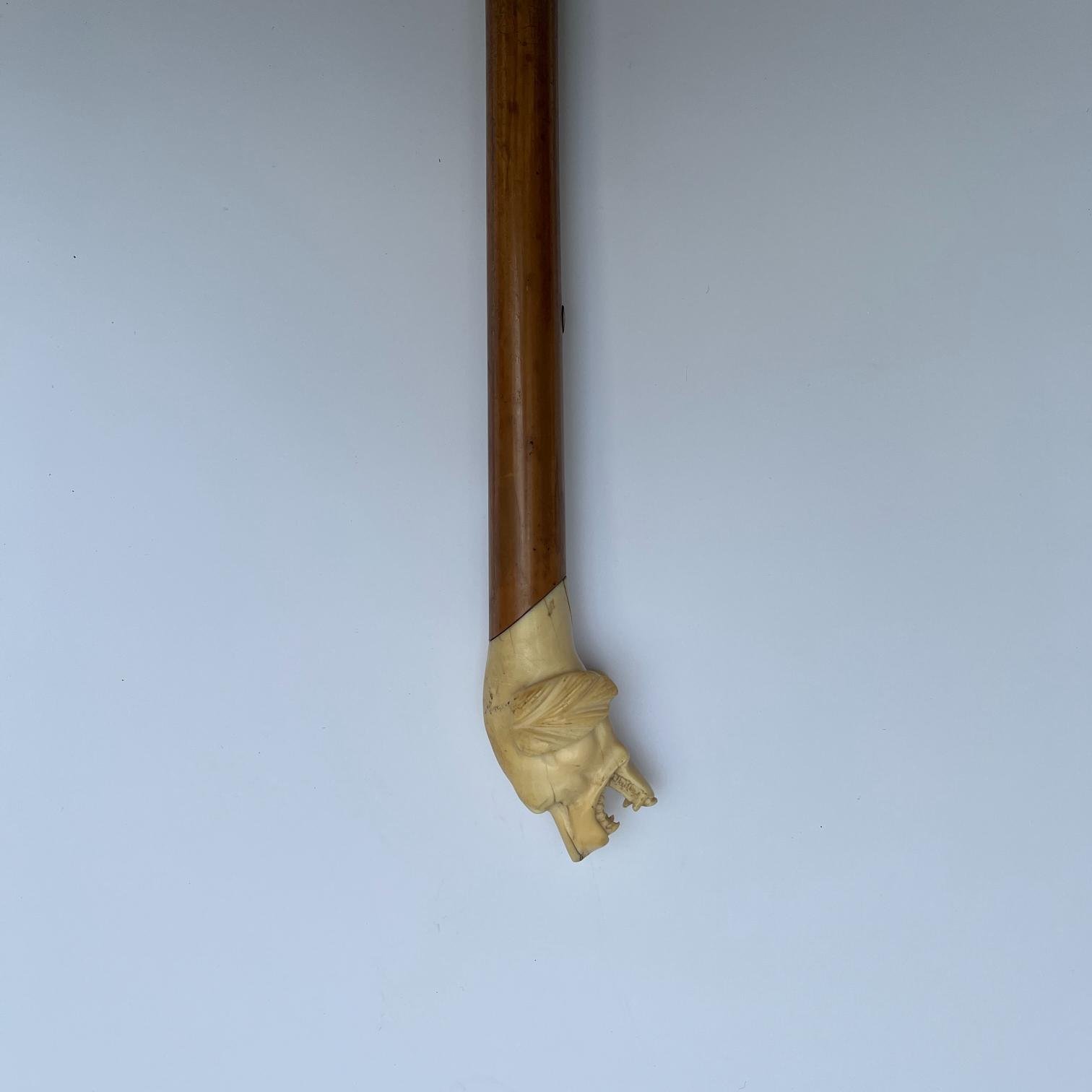 Bastón en caña con cabo en marfil esculturado «cabeza de perro», con regatón en guampa. Alto 90 cm.