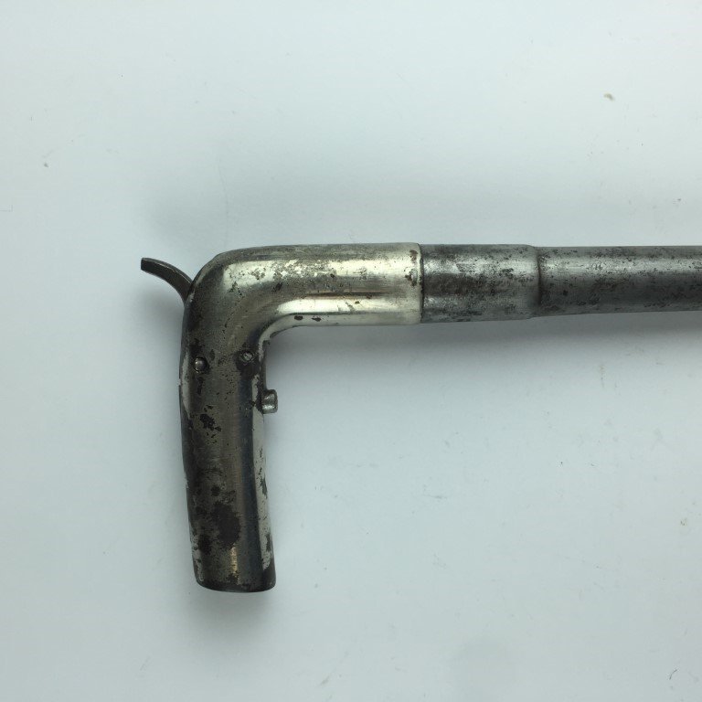Bastón escopeta de retrocarga, con caño de enroscar. Calibre 12 mm de fuego central. En hierro, con martillo a la vista. Largo 81 cm.