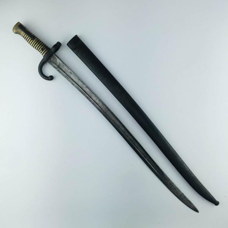 Bayoneta tipo yatagán para fusil Chassepot. Empuñadura en bronce. Vaina original en metal.