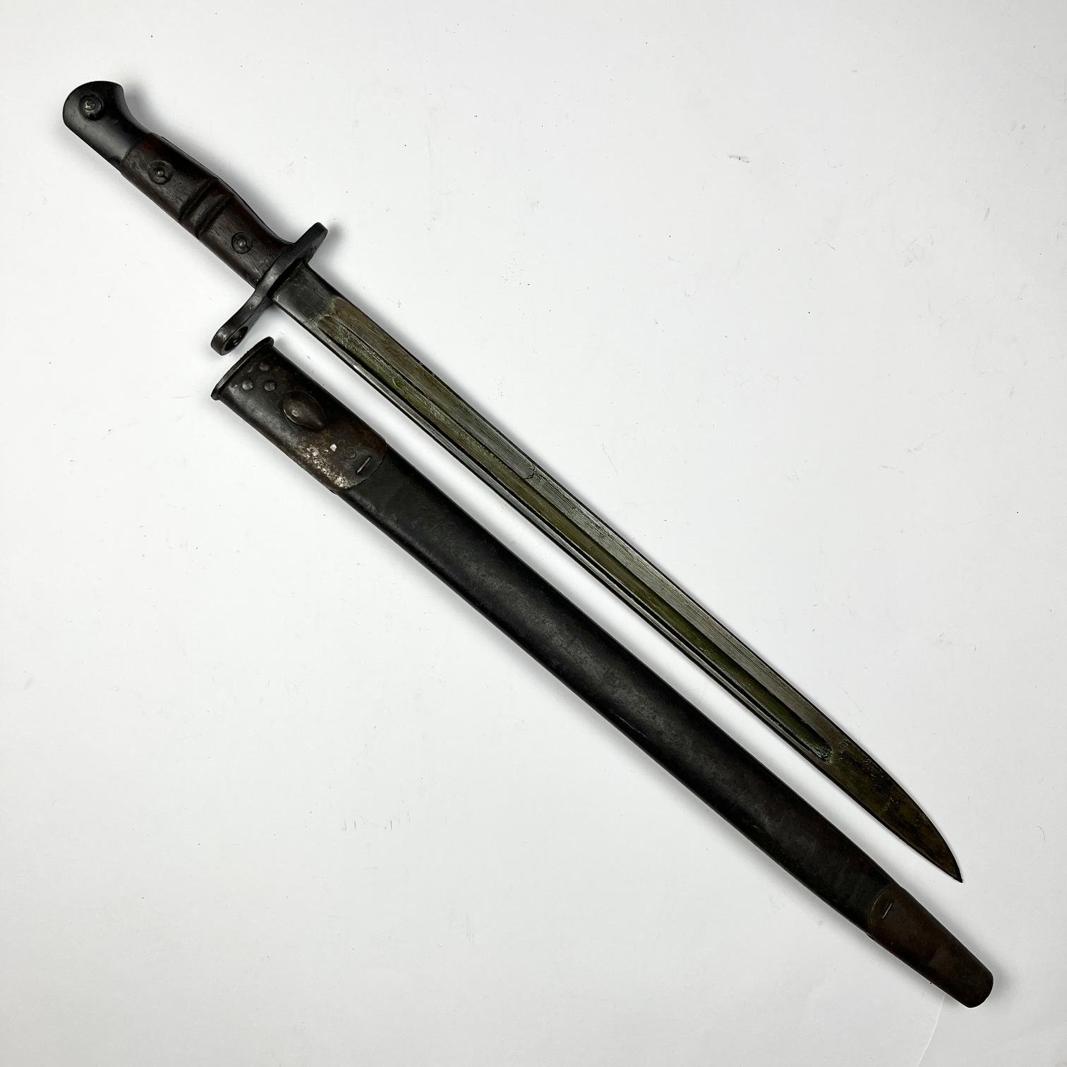 Bayoneta estadounidense para fusil Enfield P14. Empuñadura en acero y cachas de madera. Vaina metálica. Largo 55.5 cm.