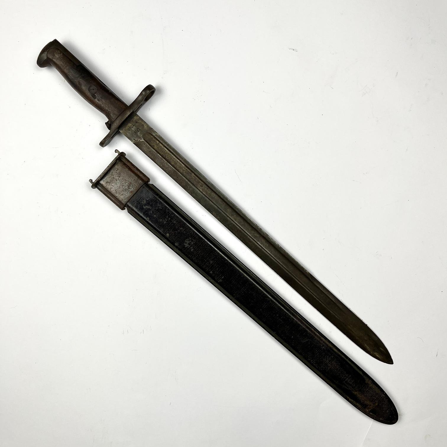 Bayoneta estadounidense para fusil Springfield. Empuñadura en metal y madera. Hoja marcada «US SA 1908». Vaina en fibra. Largo 52 cm.