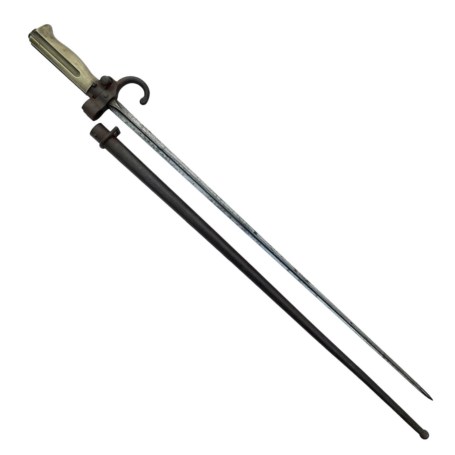 Bayoneta francesa para fusil Mauser Daudeteau 1871-94. Empuñadura metálica. Hoja cruciforme. Largo total 65 cm.