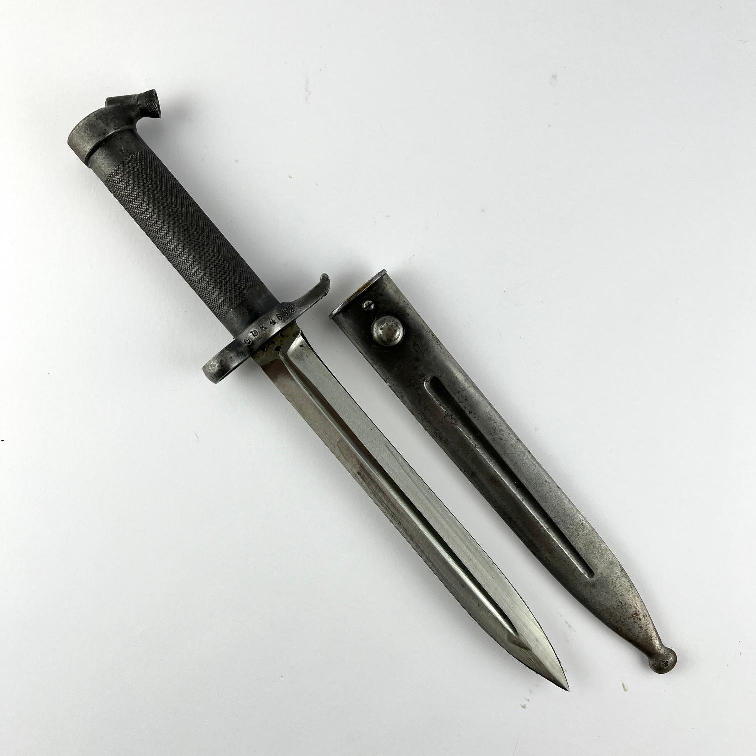 Bayoneta para fusil Mauser sueco, Carl Gustav, 1896. Empuñadura metálica tubular segrinada. Vaina metálica. Hoja marcada “EJ AB”. Largo 33 cm.
