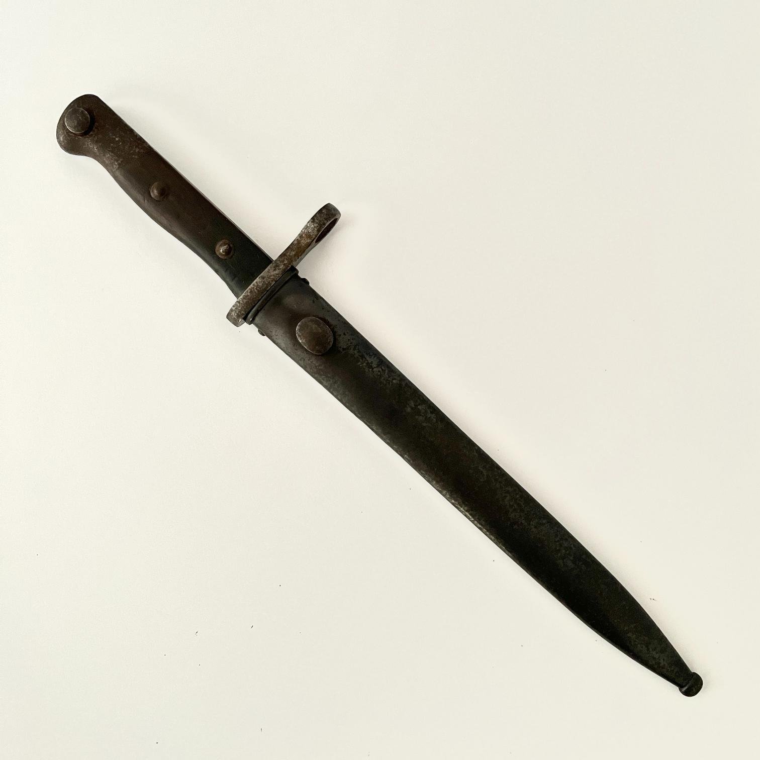 Bayoneta turca para fusil Mauser M1903. WWI y WWII. Empuñadura en acero, cachas en madera. Vaina metálica. Largo total 40 cm.