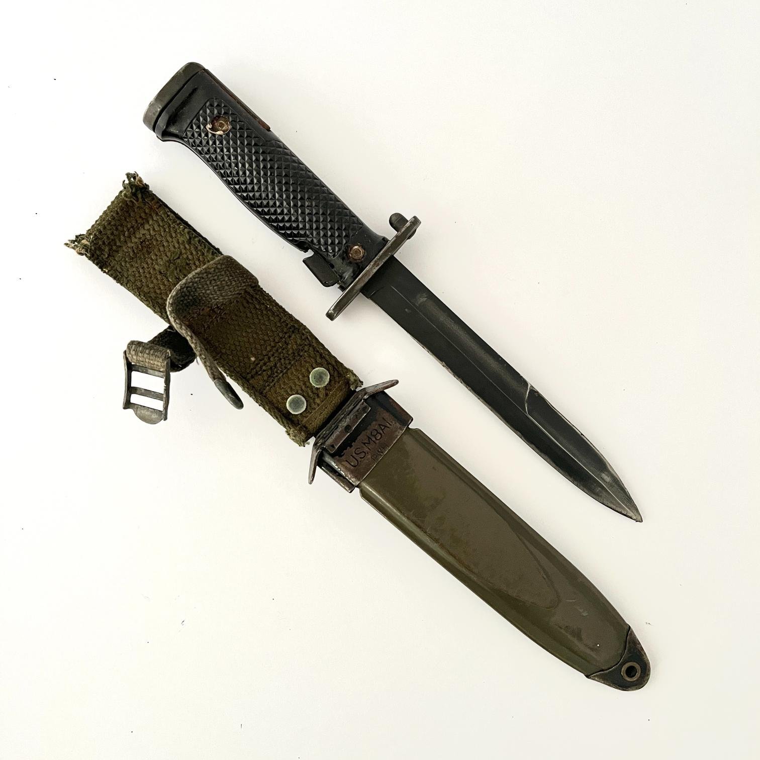 Bayoneta estadounidense US M5 para fusil M1 Garand. Empuñadura en baquelita negra. Vaina en fibra color verde, bocavaina y puntera metálicos. Largo 29 cm.