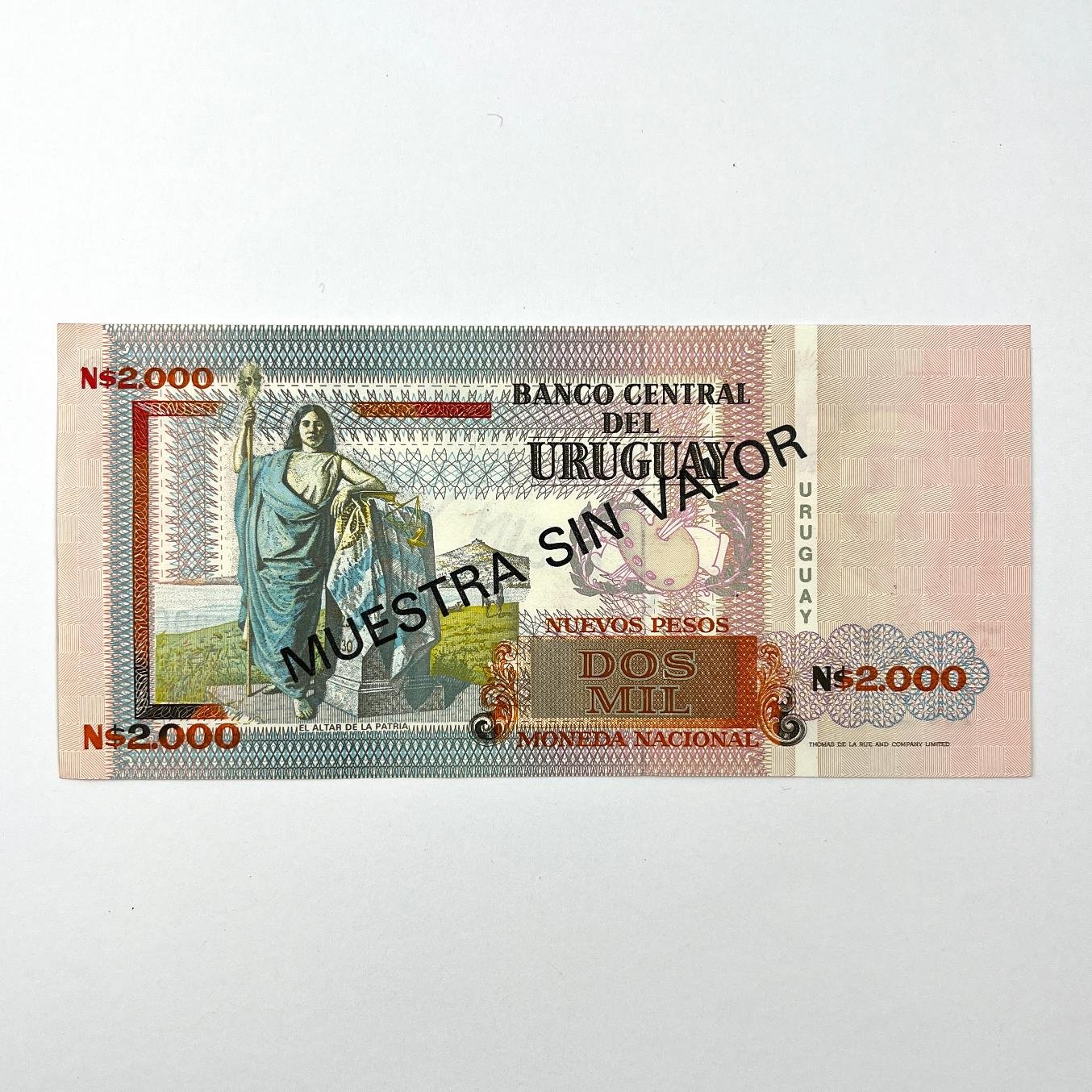 Billete uruguayo espécimen denominación 2.000 nuevos pesos, año 1989, serie A, No. 00180, sellado “muestra sin valor”, en ambas caras.