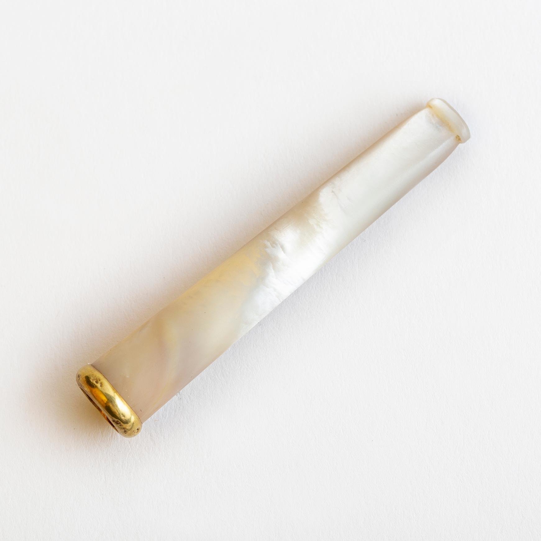 Boquilla francesa en nácar tallado con virola en oro 18 K amarillo. Largo 65 mm. En estuche original.