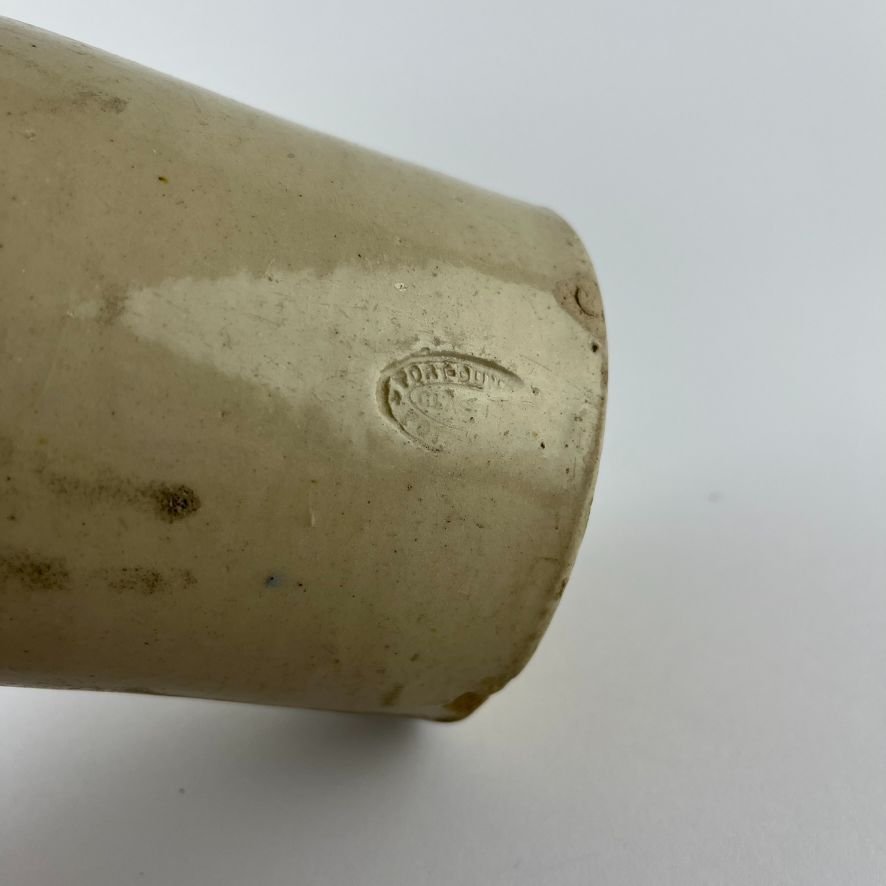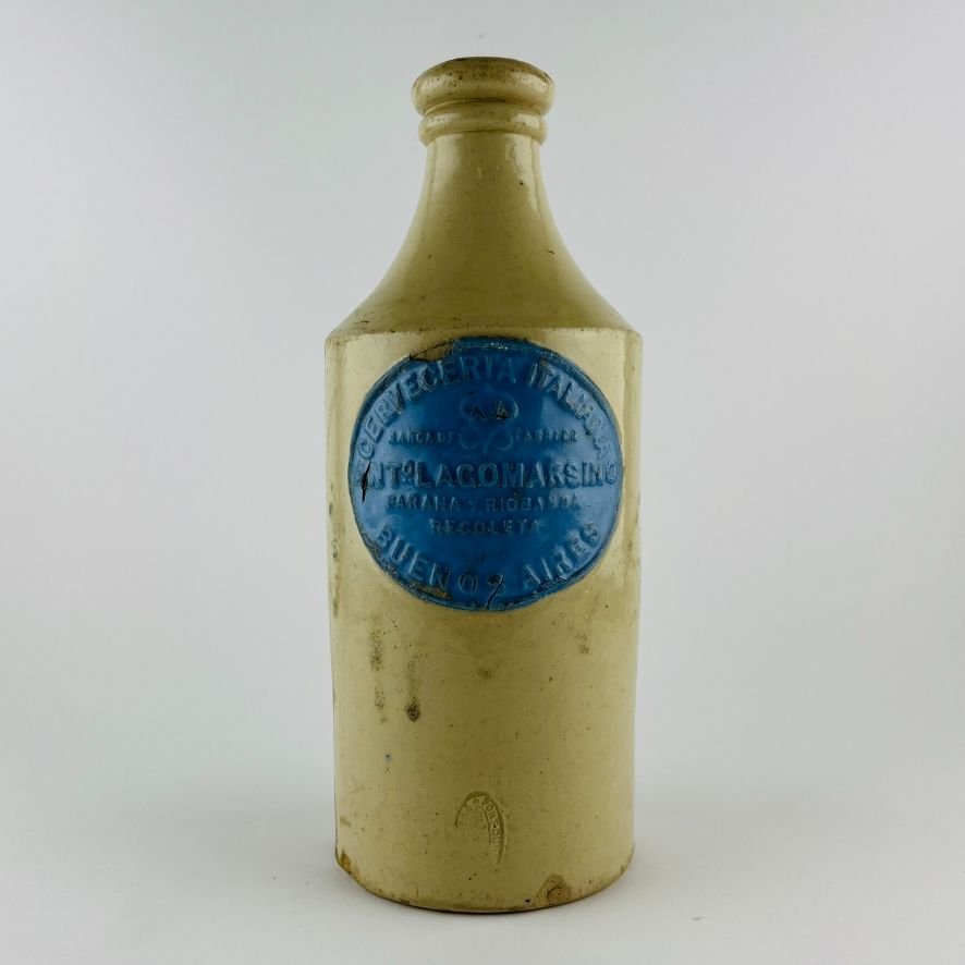 Botella de cerveza en gres. «Cervecería italiana Ant.o. Lagomasino. Paraná y Riobamba. Recoleta. Buenos Aires.» Doble etiqueta oval en porcelana celeste. Sello inciso del fabricante Port Dundas, Glasgow. Pequeñas cascaduras en base. Alto 22.5 cm.