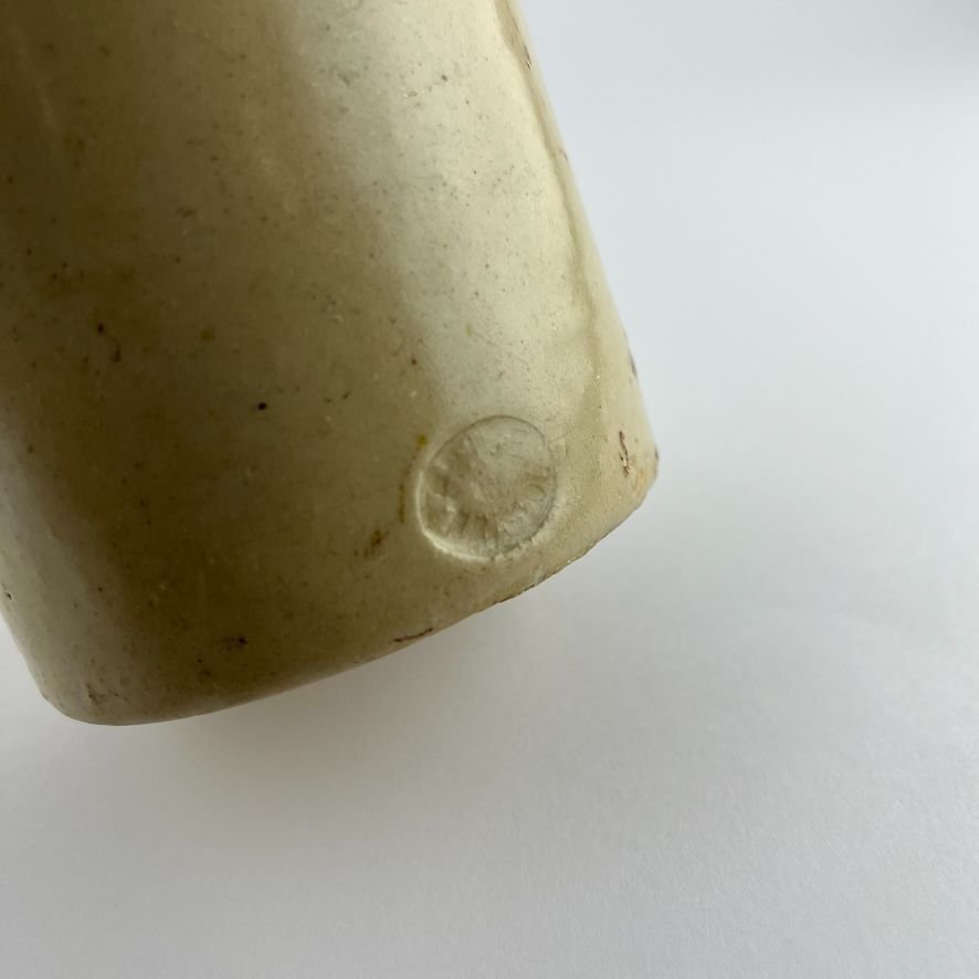 Botella de cerveza argentina en gres. «Juan Bühler. Bolívar 320.» Marca en letra incisa, pintada en negro. Sello inciso del fabricante Price, Bristol. Alto 22.5 cm.
