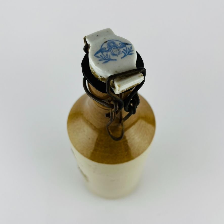 Botella escocesa en gres. En dos tonos. Tapón en porcelana y alambre. Sello inciso del fabricante Buchan, Portobello. Alto 22 cm.