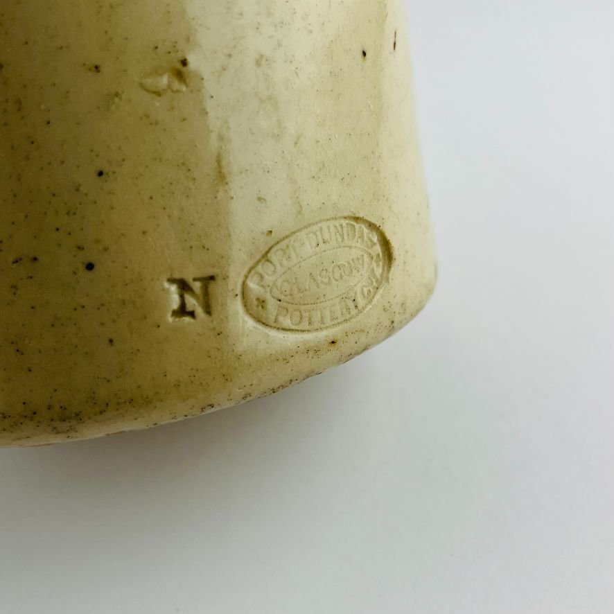 Botella de cerveza uruguaya en gres. «Cervecería Oriental Robillard». Sello en cerámica celeste. Sello inciso del fabricante Port Dundas, Glasgow. Pelo en parte trasera. Alto 26 cm.