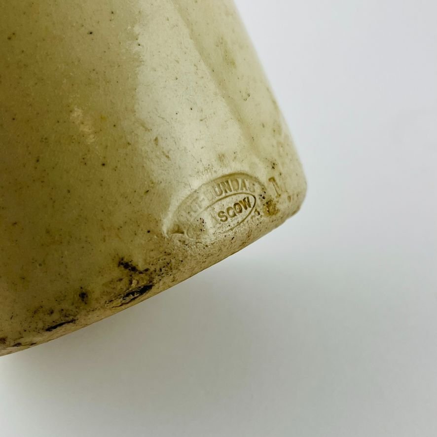 Botella de cerveza uruguaya en gres. «Cervecería y Licorería de la Esperanza. Trigo Hnos. Montevideo. Calle Andes No. 41.» Marca estampada en negro. Sello inciso del fabricante Port Dundas, Glasgow. Pico restaurado. Alto 27 cm.