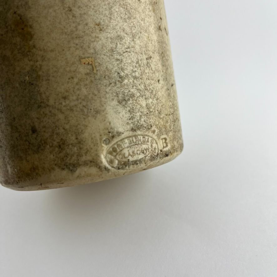 Botella de cerveza uruguaya en gres. «Cervecería Toedter y Hageman. Salto. T.H. Marca de Fábrica.» Etiqueta oval celeste en cerámica, restaurada. Sello inciso del fabricante Port Dundas, Glasgow. Pelo en lateral. Alto 26 cm.