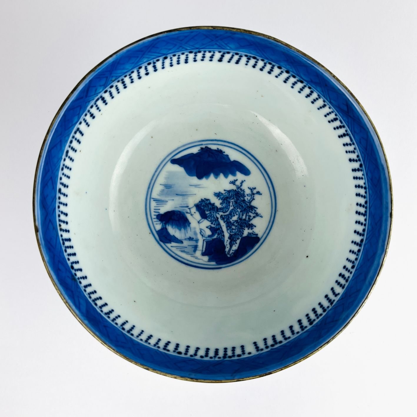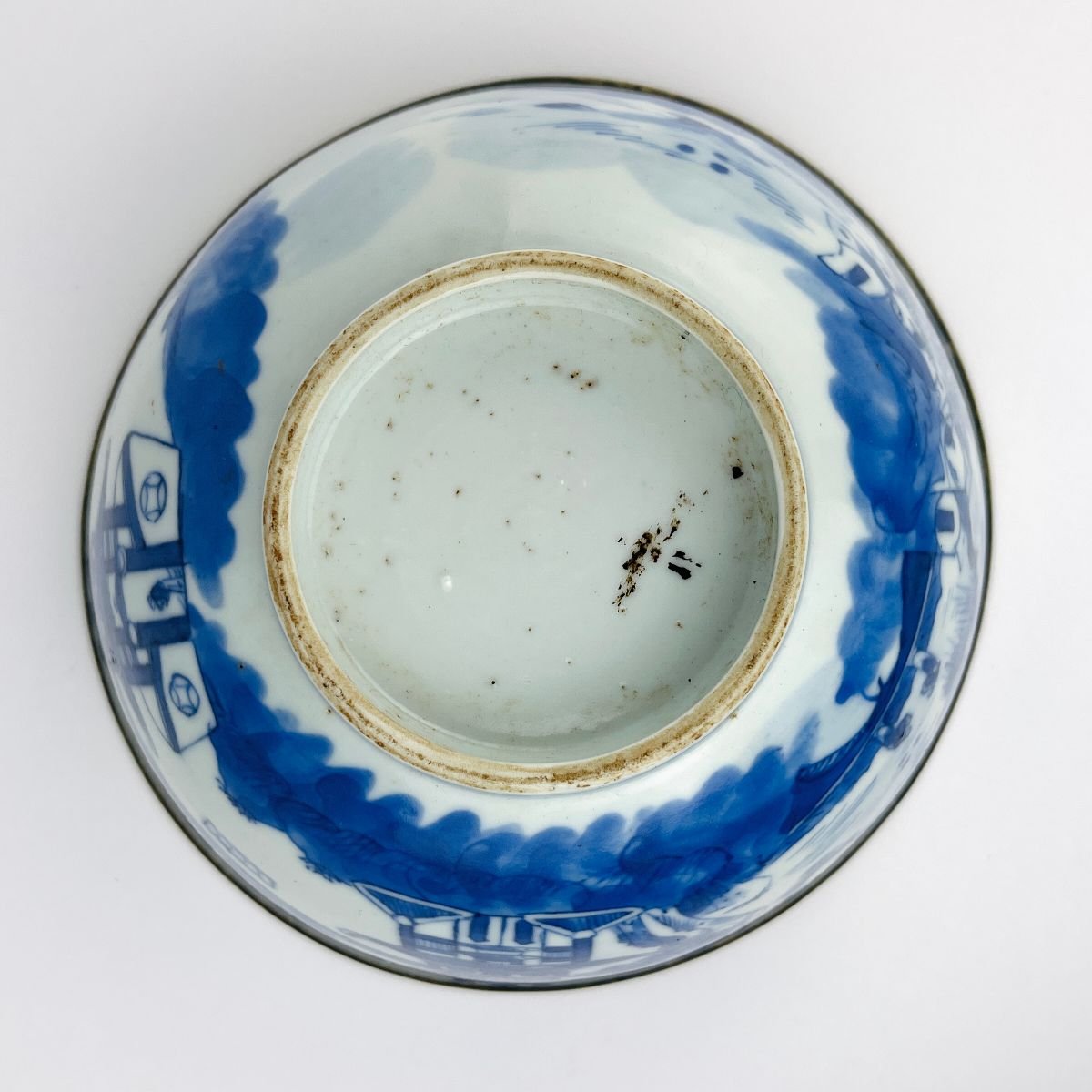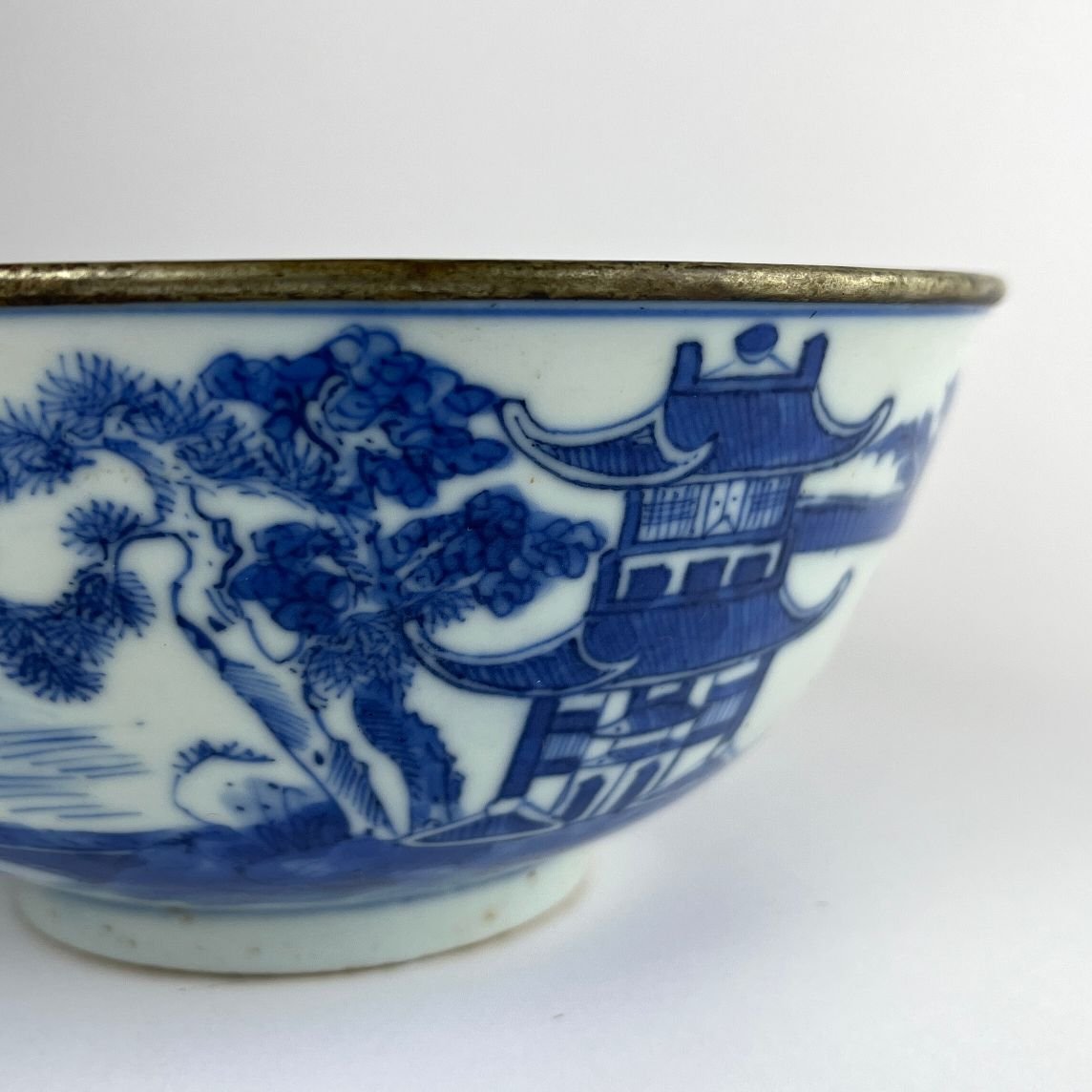 Bowl chino en porcelana azul y blanca s. XVIII decorado «paisajes», con borde en plata fundida. 7 x 15.8 cm.