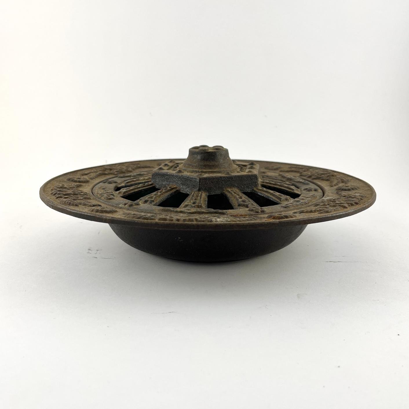 Brasero japonés en hierro fundido con borde cincelado «crisantemos», con tapa calada. 7 x 27 cm. Sello ilegible en la base.