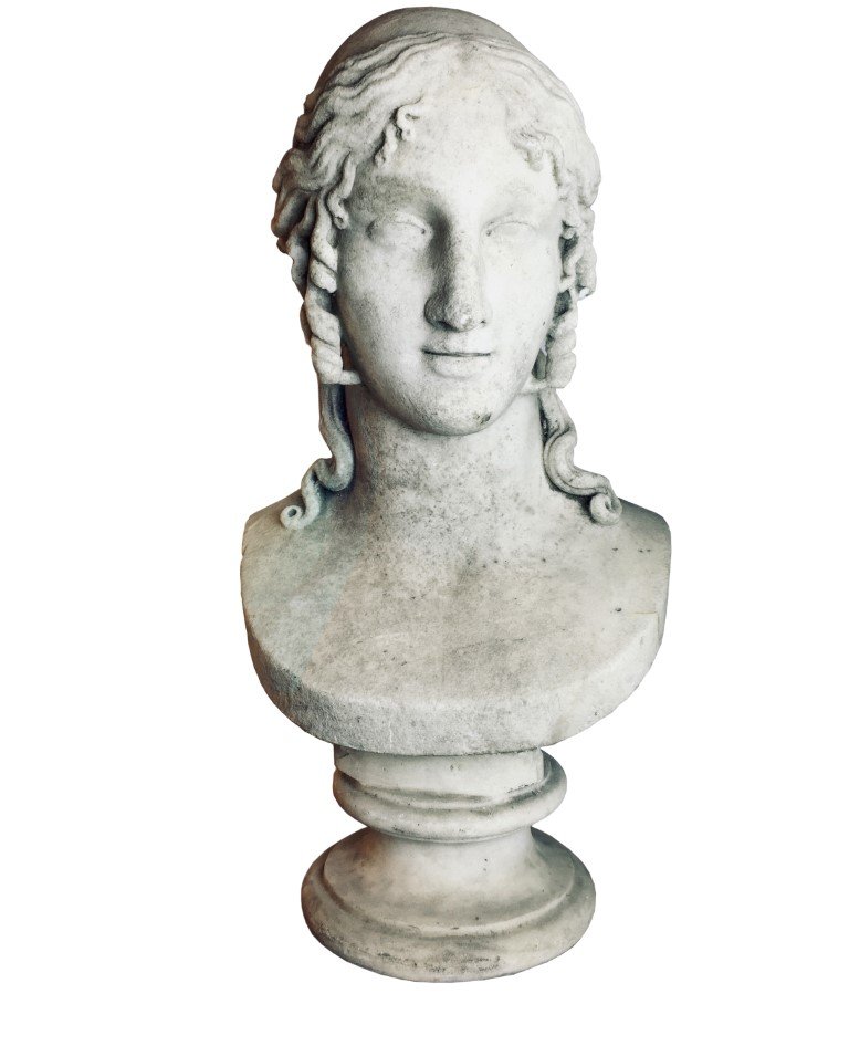 Busto en mármol de Carrara. «Dama romana.» 50 x 33 x 30 cm. Presentado sobre pedestal de mármol blanco. Alto total 65 cm.