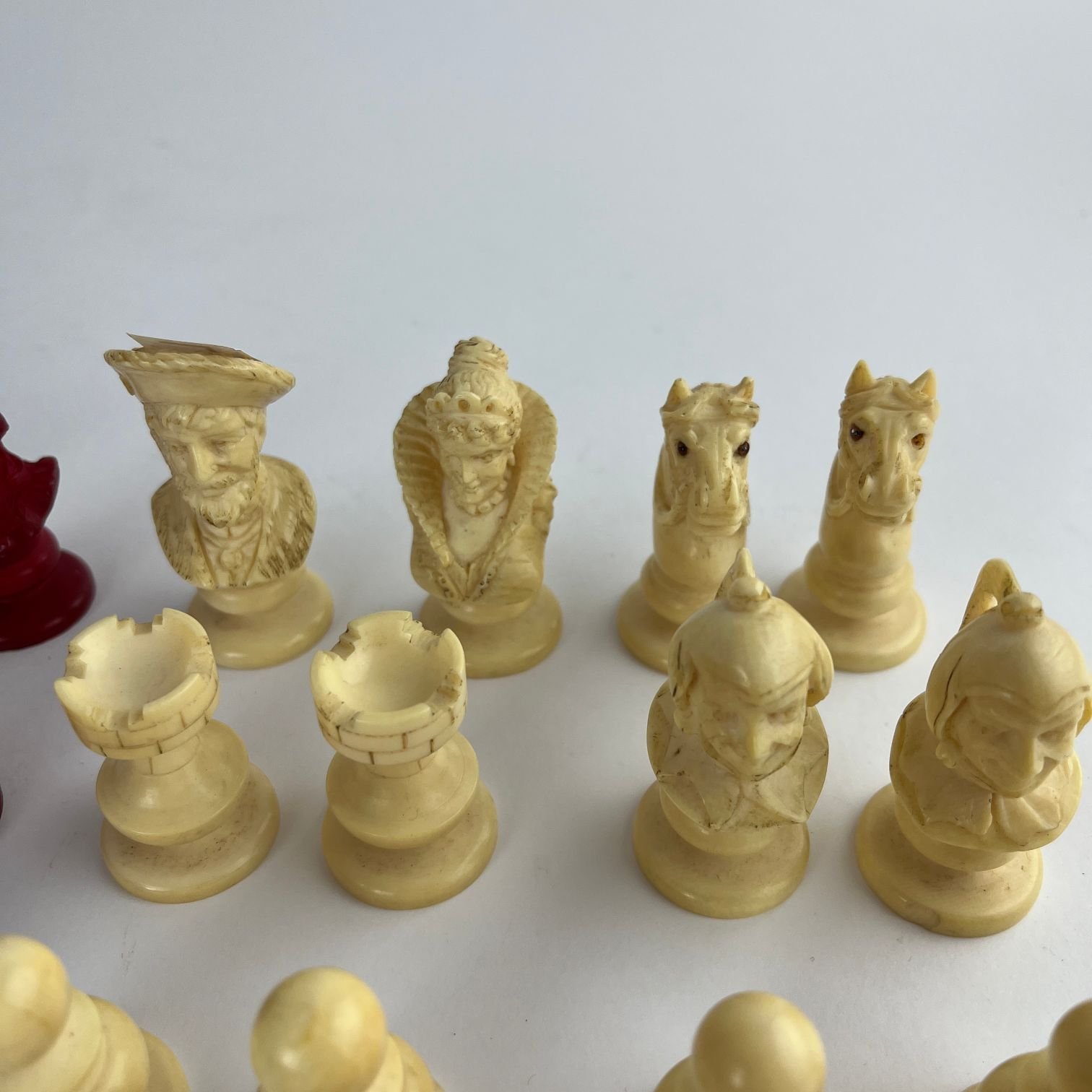 Juego de piezas de ajedrez en marfil tallado y teñido de rojo, completo
