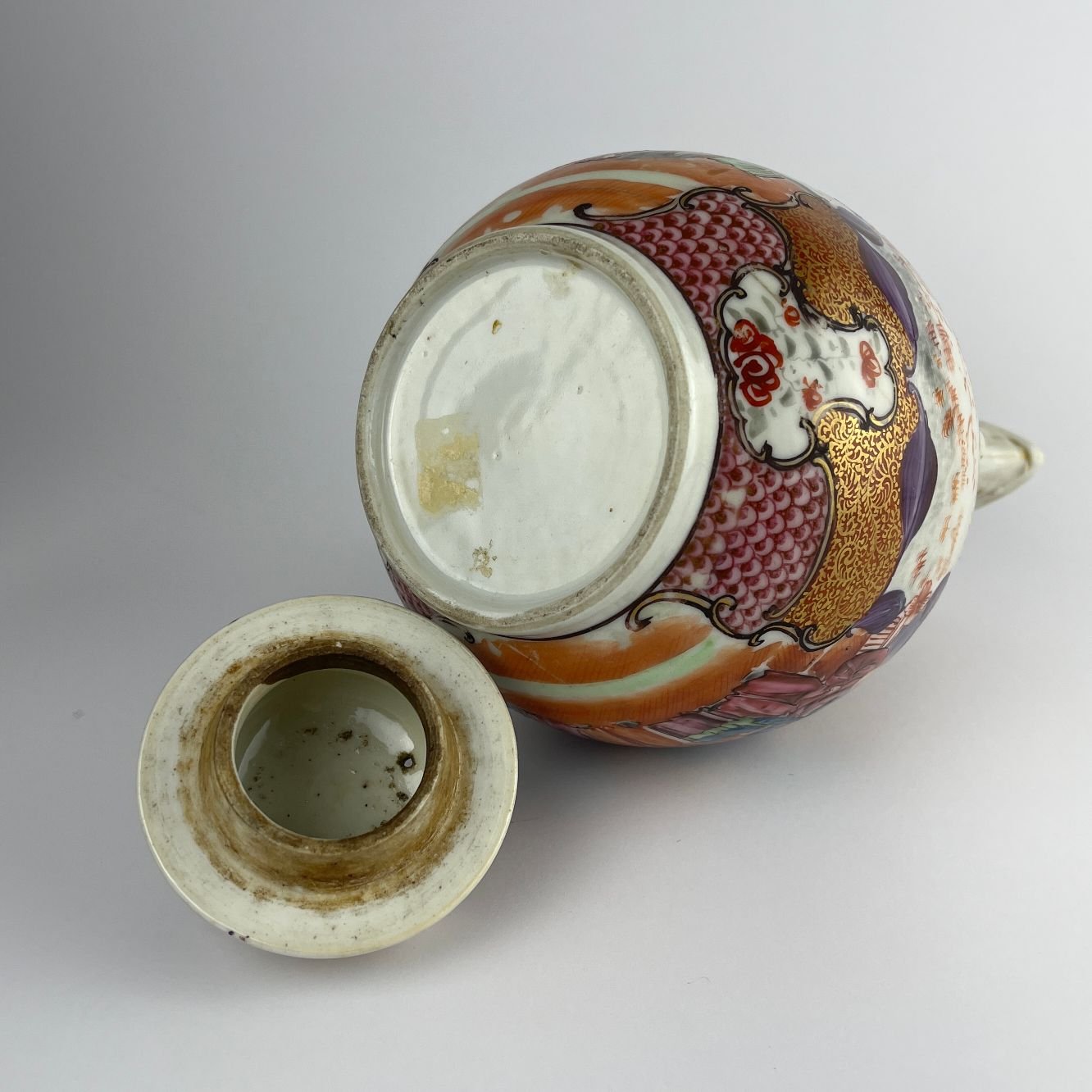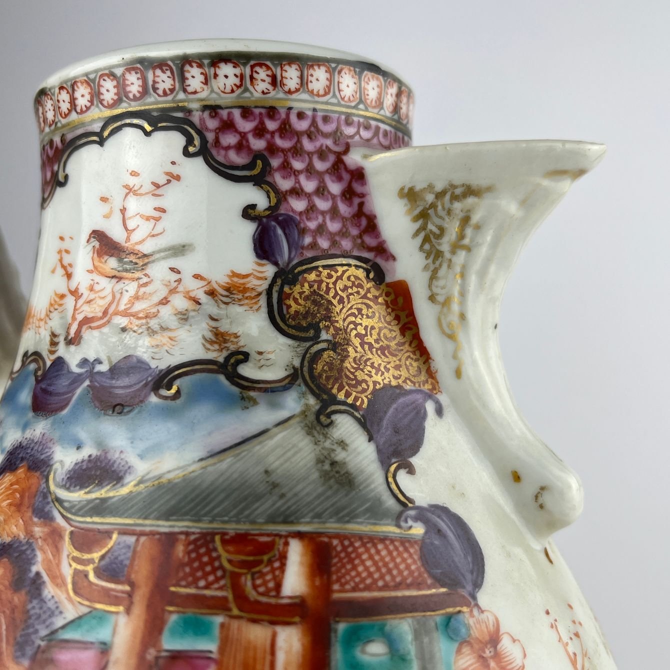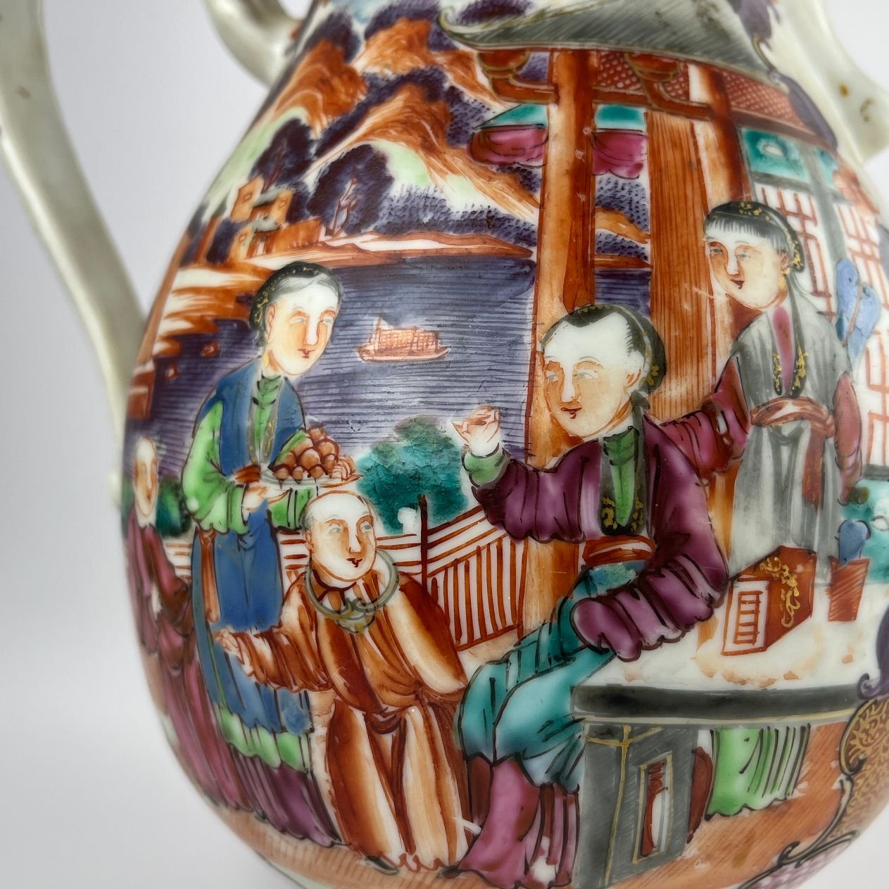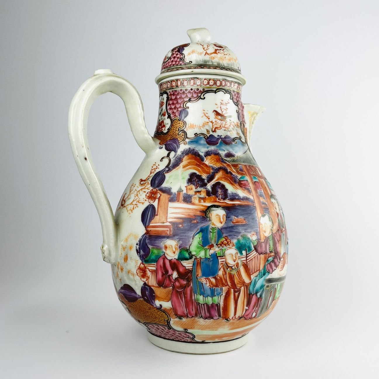 Cafetera china en porcelana Familia Rosa estilo «mandarin pattern» s. XVIII decorada «escenas típicas». Alto 25 cm.