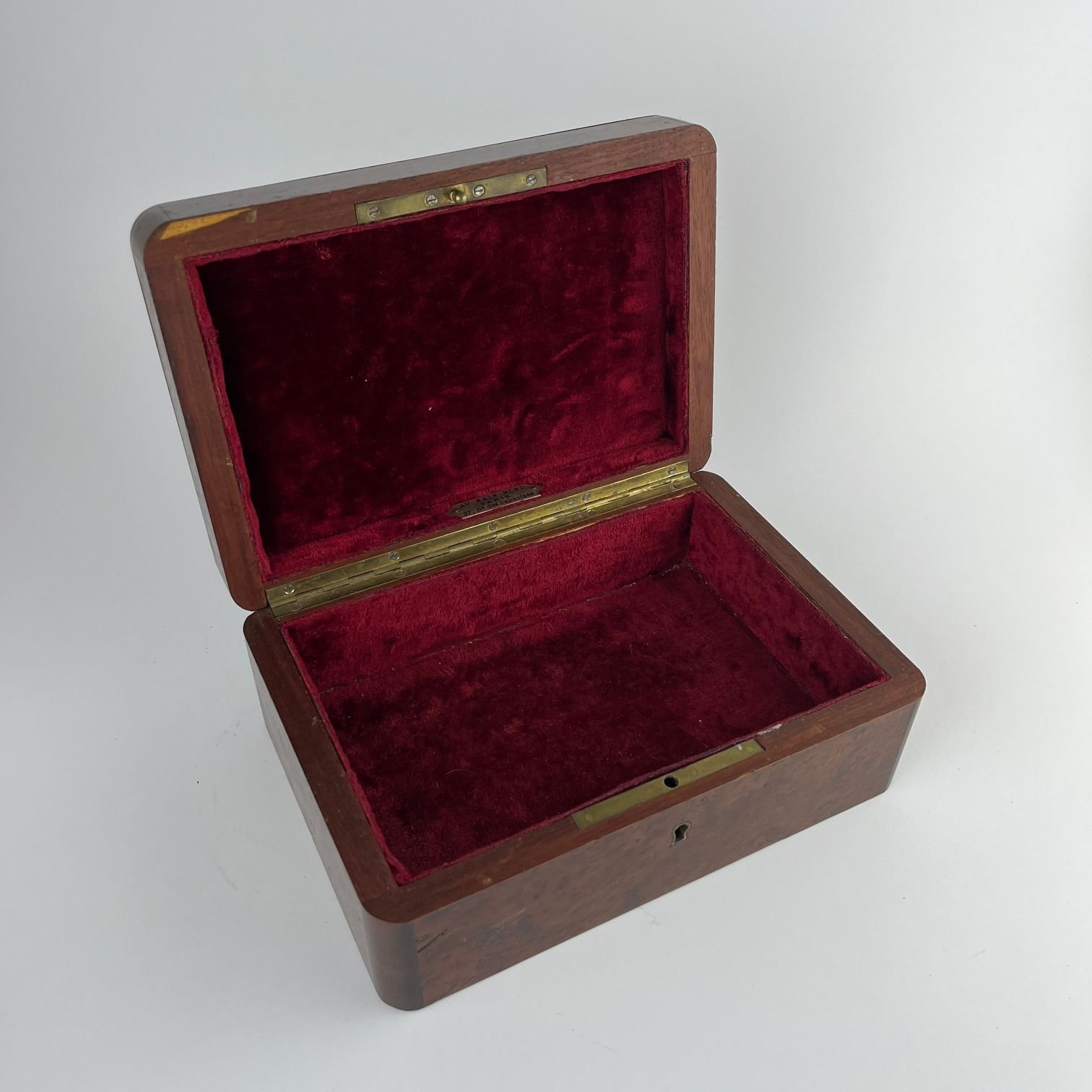 Caja alhajera francesa en madera enchapada en raíz de nogal. Tapa con marqueterie «floral» en diferentes maderas y nácar. Interior forrado en pana bordeaux. 8 x 20 x 14 cm.