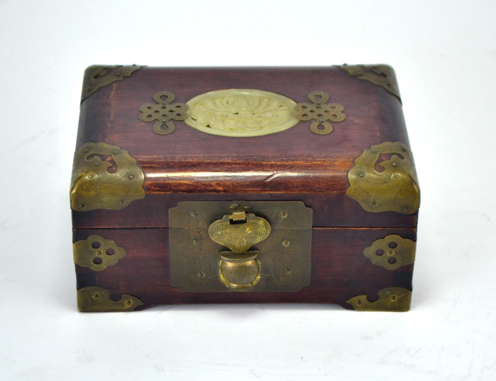 Caja alhajero china en madera con bisagras, monturas y herraje en bronce cincelado «hojas». Tapa decorada con placa oval en jade tallado y calado. 8.5 x 17.2 x 13 cm.