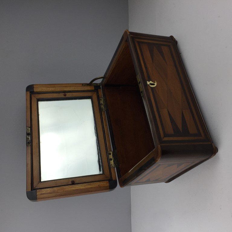 Caja piamontesa siglo XIX en diferentes maderas, decorada con parqueterie. Tapa interior con espejo. Chapa en bronce fechada «1875». 17 x 33 x 22 cm.