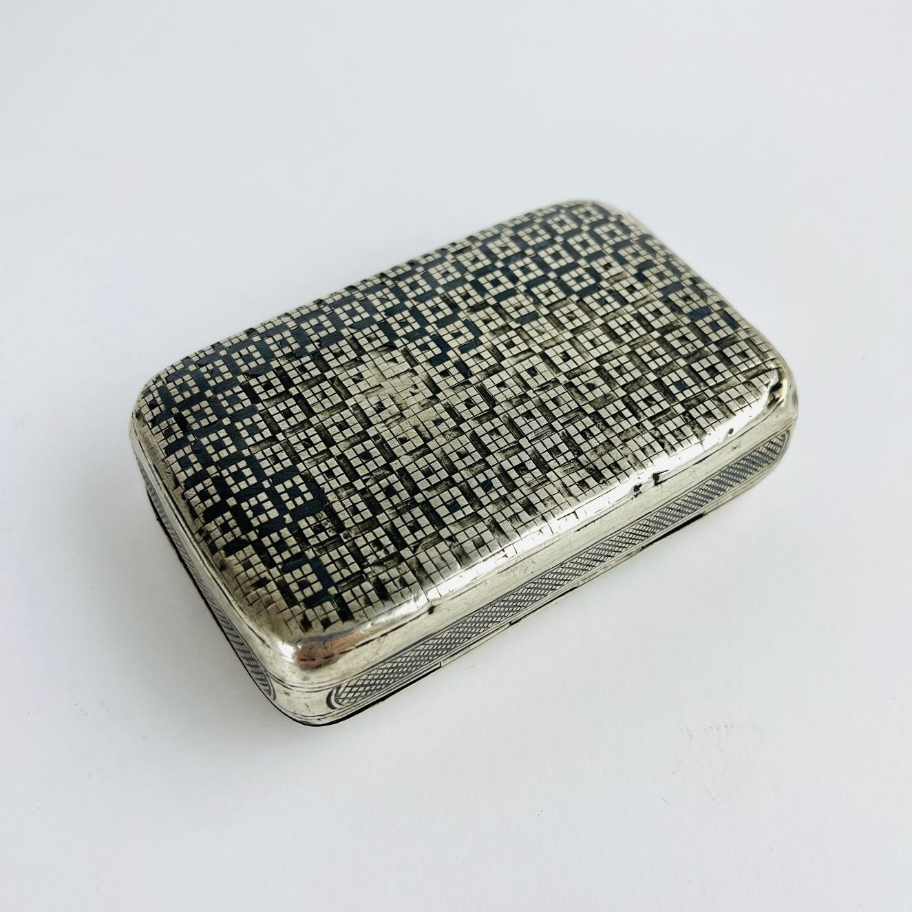 Pequeña caja rusa en plata cincelada «paisaje» con detalles nielados. 2.5 x 9.5 x 6 cm. Presenta pequeñas averías y desgastes. Peso 140 gr.