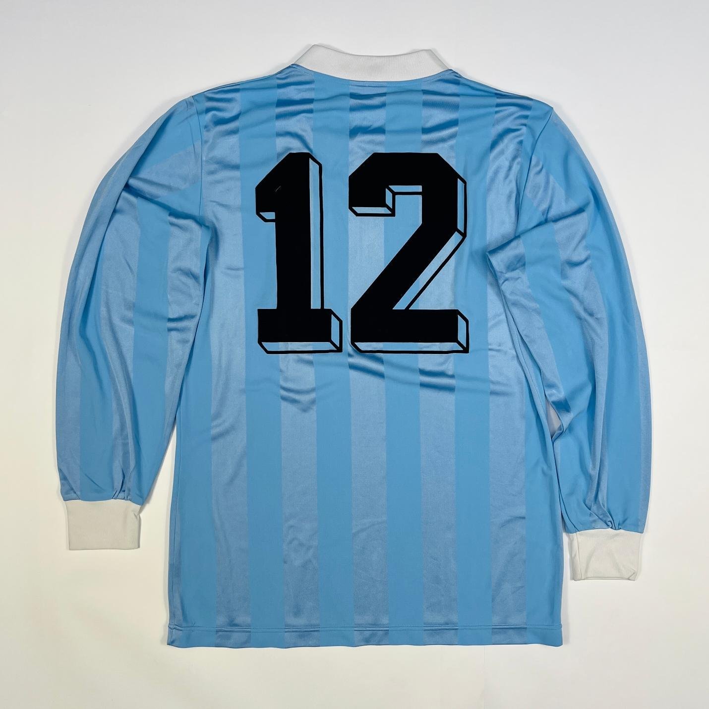 Camiseta de la Selección Uruguaya de Fútbol, número 12, año 1985, marca Le Coq Sportif, de fabricación japonesa.