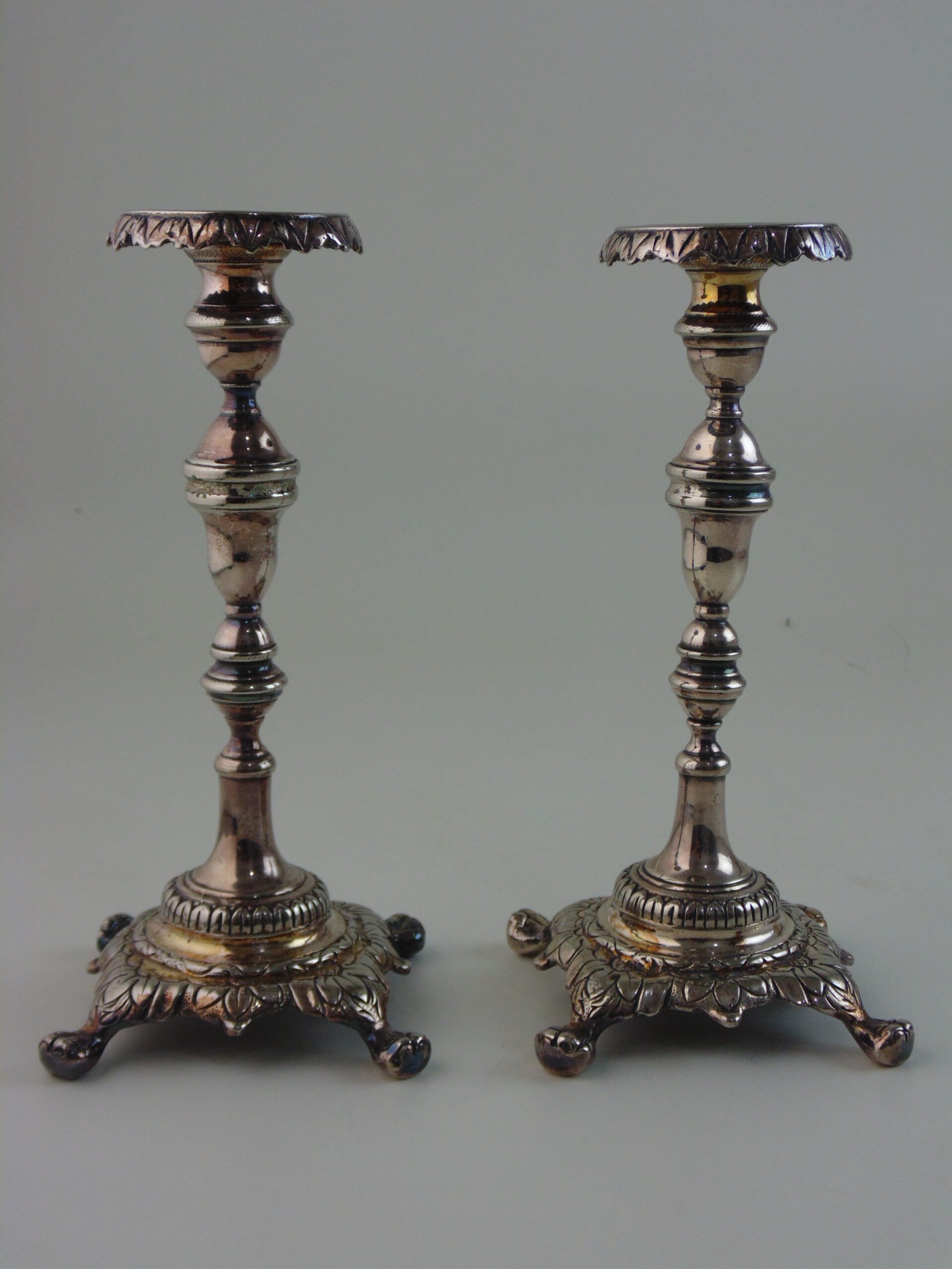 Par de candeleros en plata portuguesa cincelada «hojas». Base cuadrada, con cuatro patas en forma de garras. Alto 21 cm.
