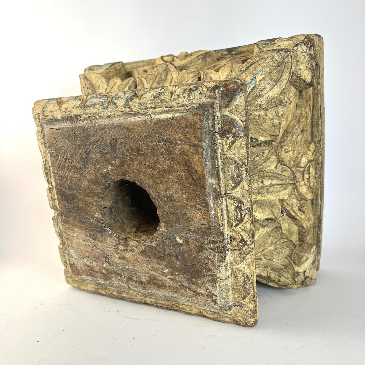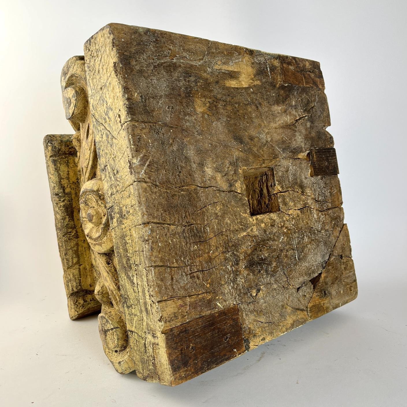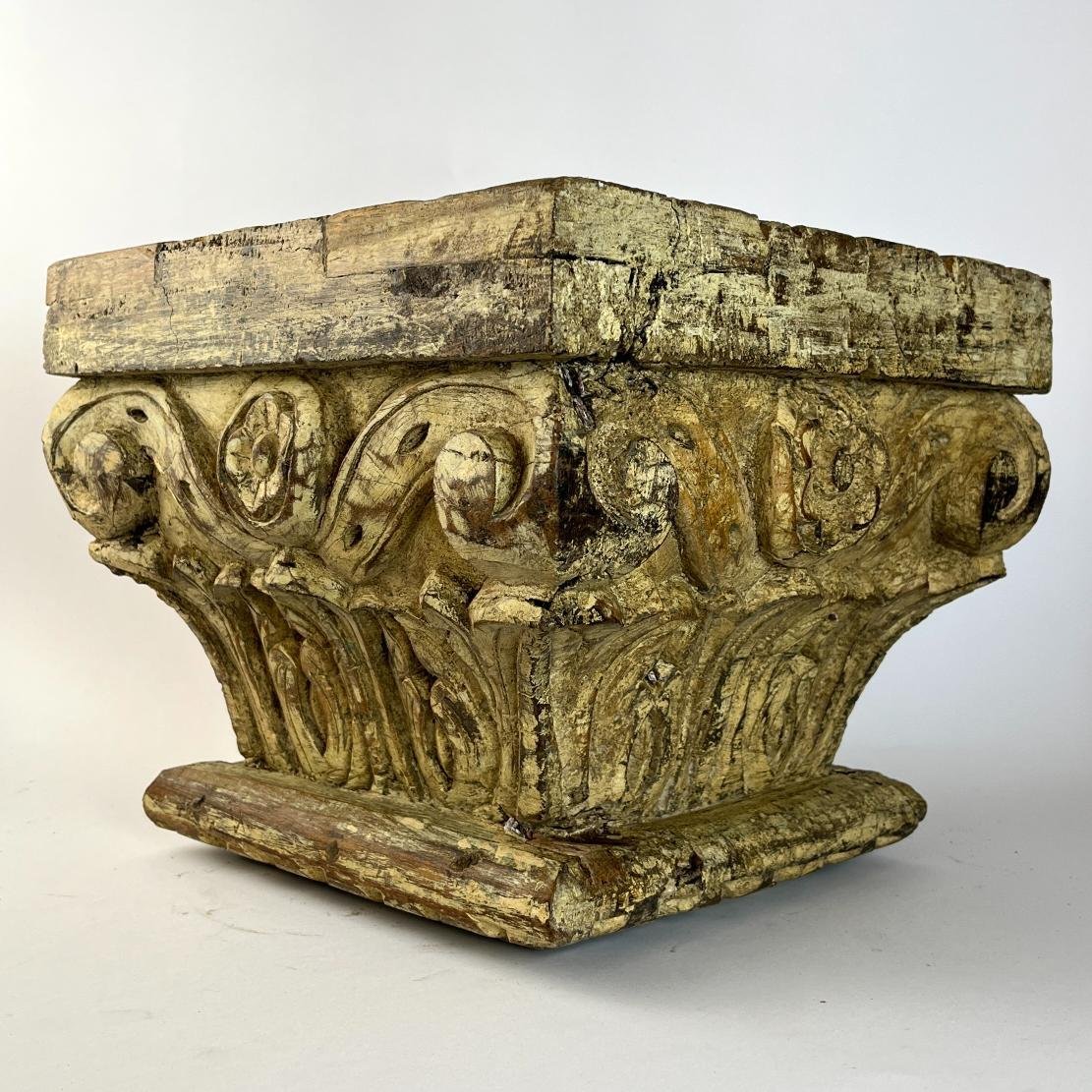 Capitel s. XIX en madera dura tallada «hojas y flores», con restos de policromía. 24 x 30 x 30 cm.