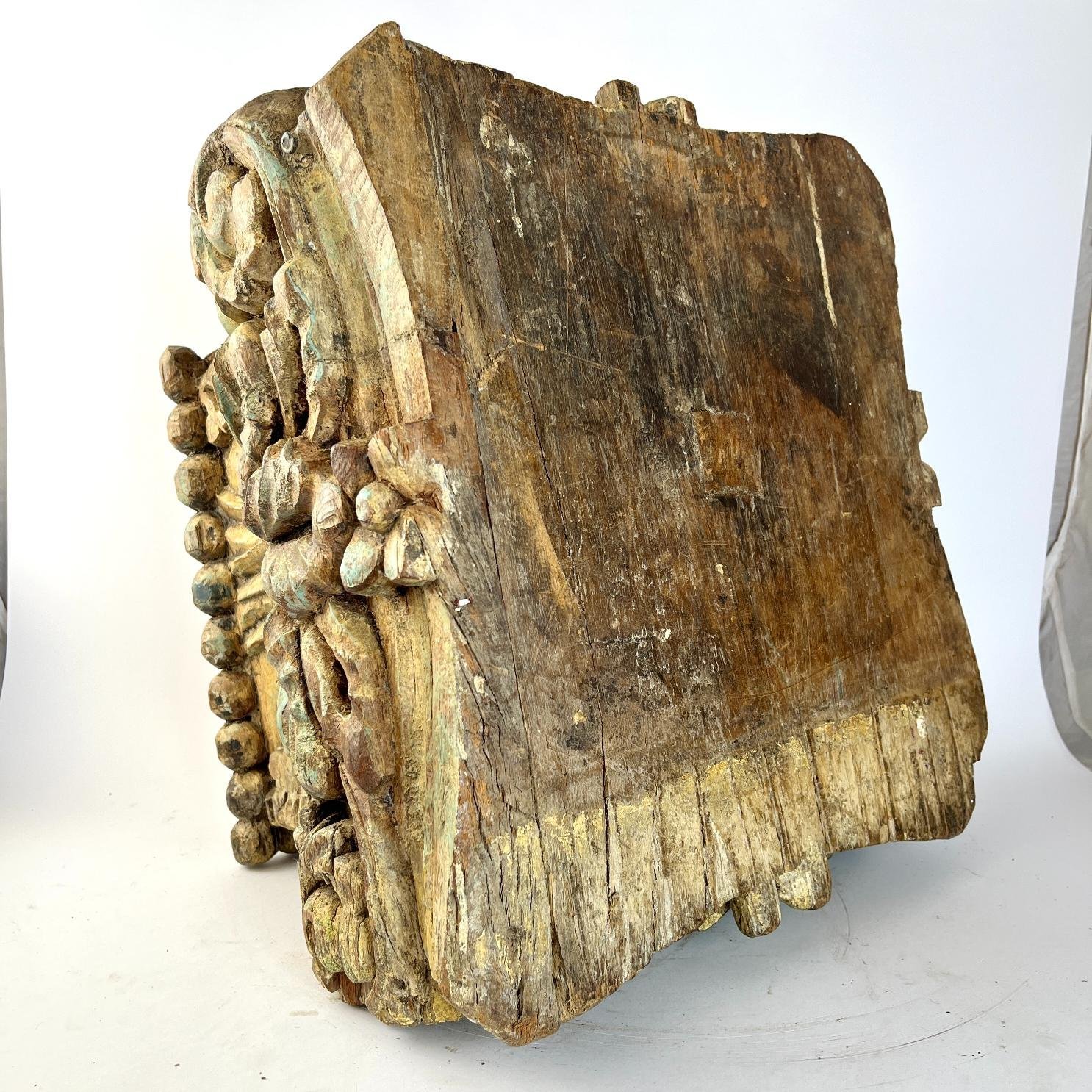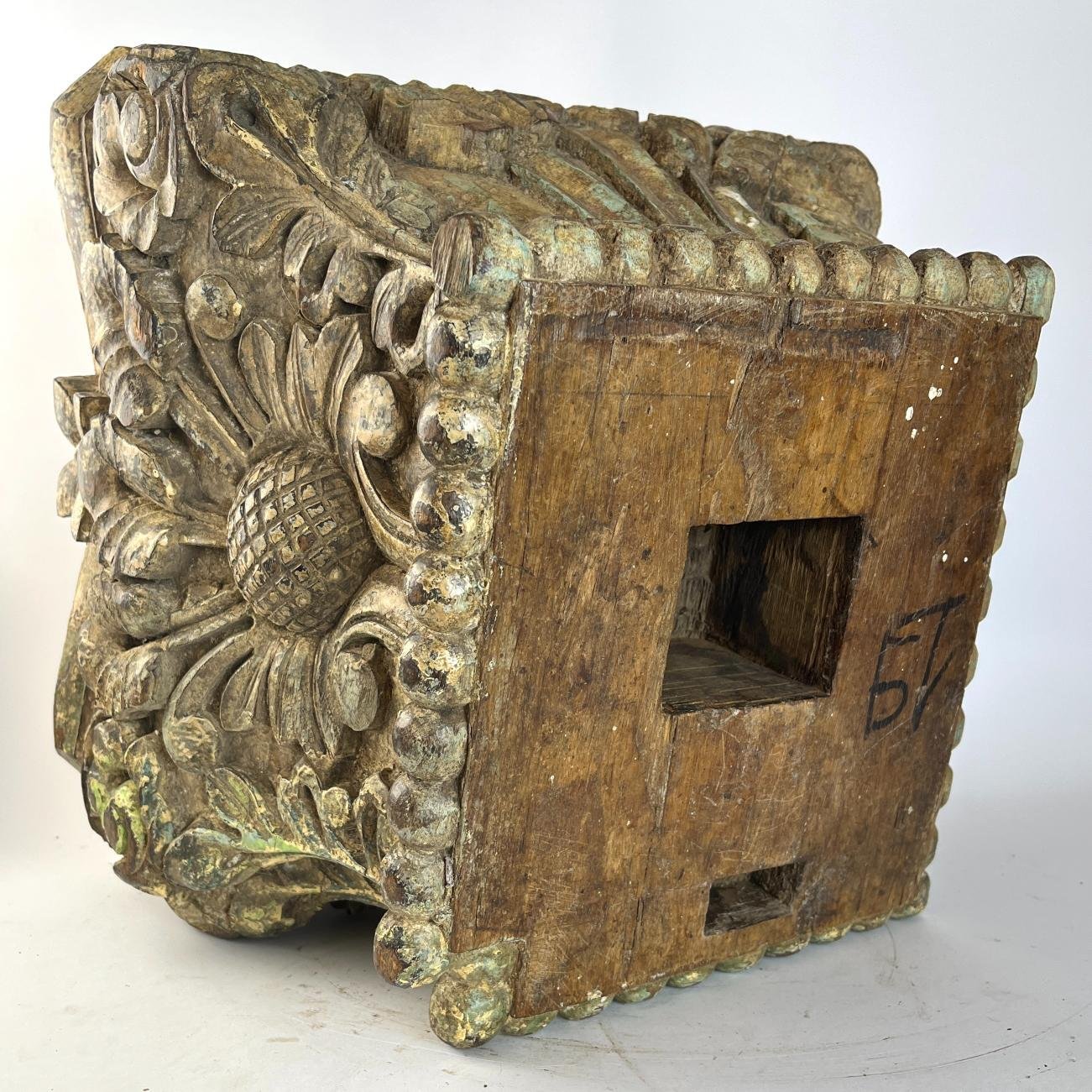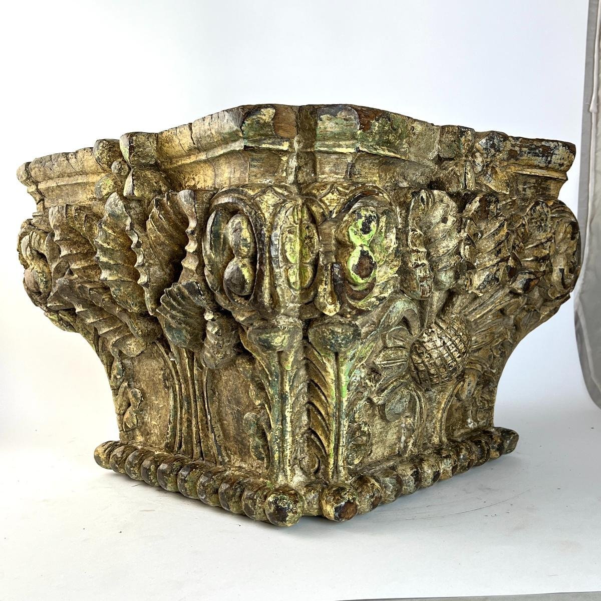 Capitel s. XIX en madera dura tallada «hojas y flores», con restos de policromía. 28 x 36 x 36 cm.
