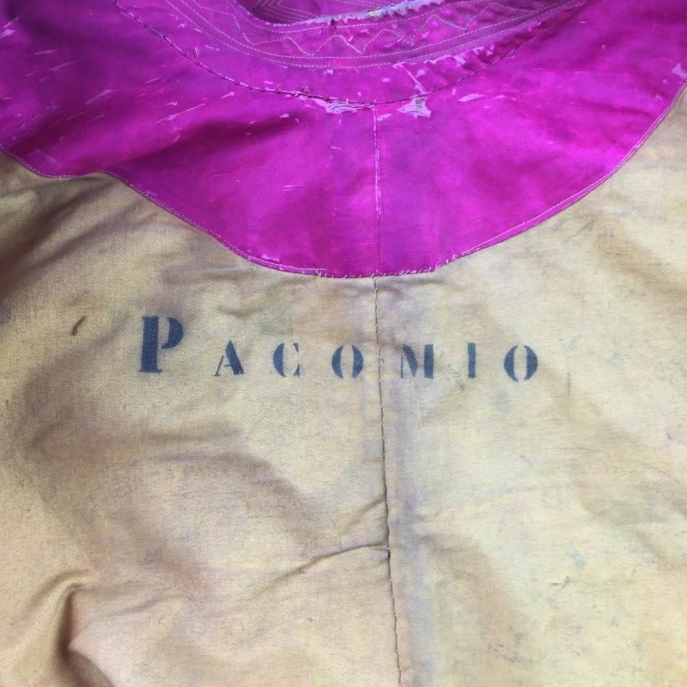 Capote de brega perteneciente al torero Pacomio Peribáñez (Valladolid 1882 – Madrid 1964), sellado «Pacomio» en interior. Con antiguas manchas de sangre.