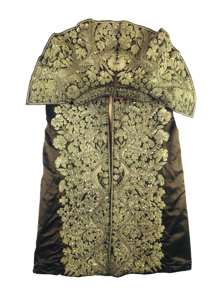 Capote de paseo de torero en seda color tabaco bordada «flores» en filigrana plateada y lentejuelas doradas.