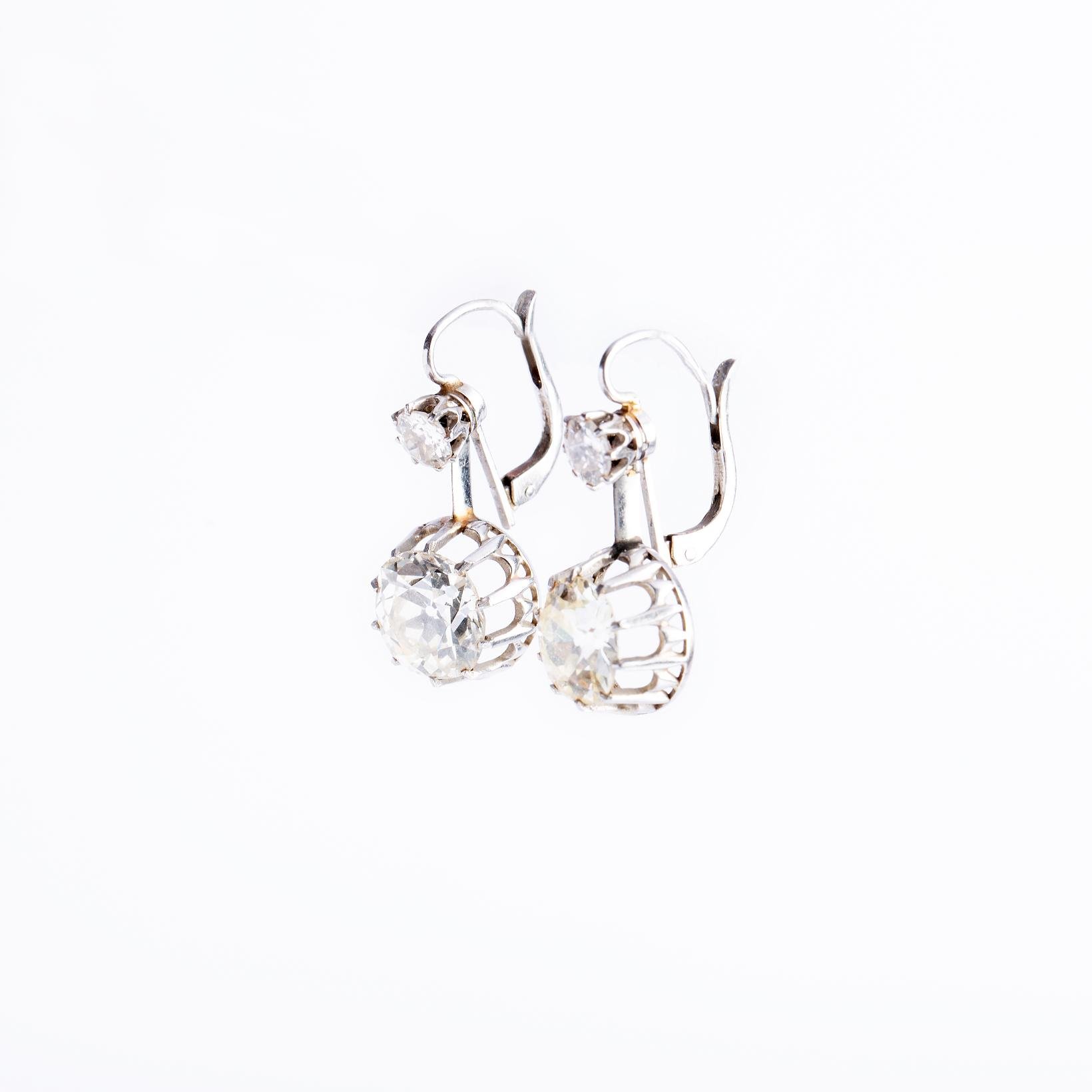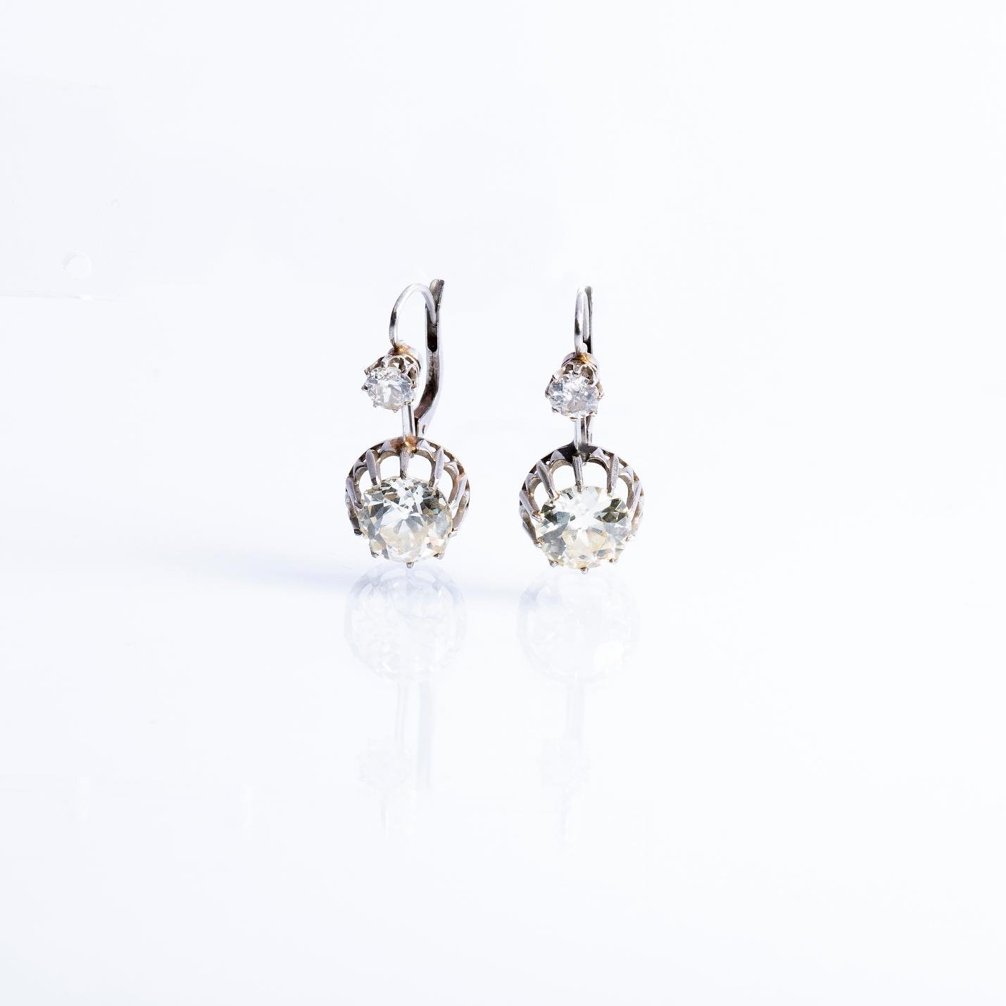Par de caravanas en oro 18 K blanco con dos diamantes talla brillantes en cada una, los dos principales de 2,5 ct aprox. cada uno (uno de un diámetro de 8,45 mm y un alto de 4,32 mm, otro de un diámetro de 8,6 mm y un alto de 5,4 mm), y las dos secundarias de 0,40 ct aprox. cada una. Peso bruto total 5,9 gr. Alto 25 mm.