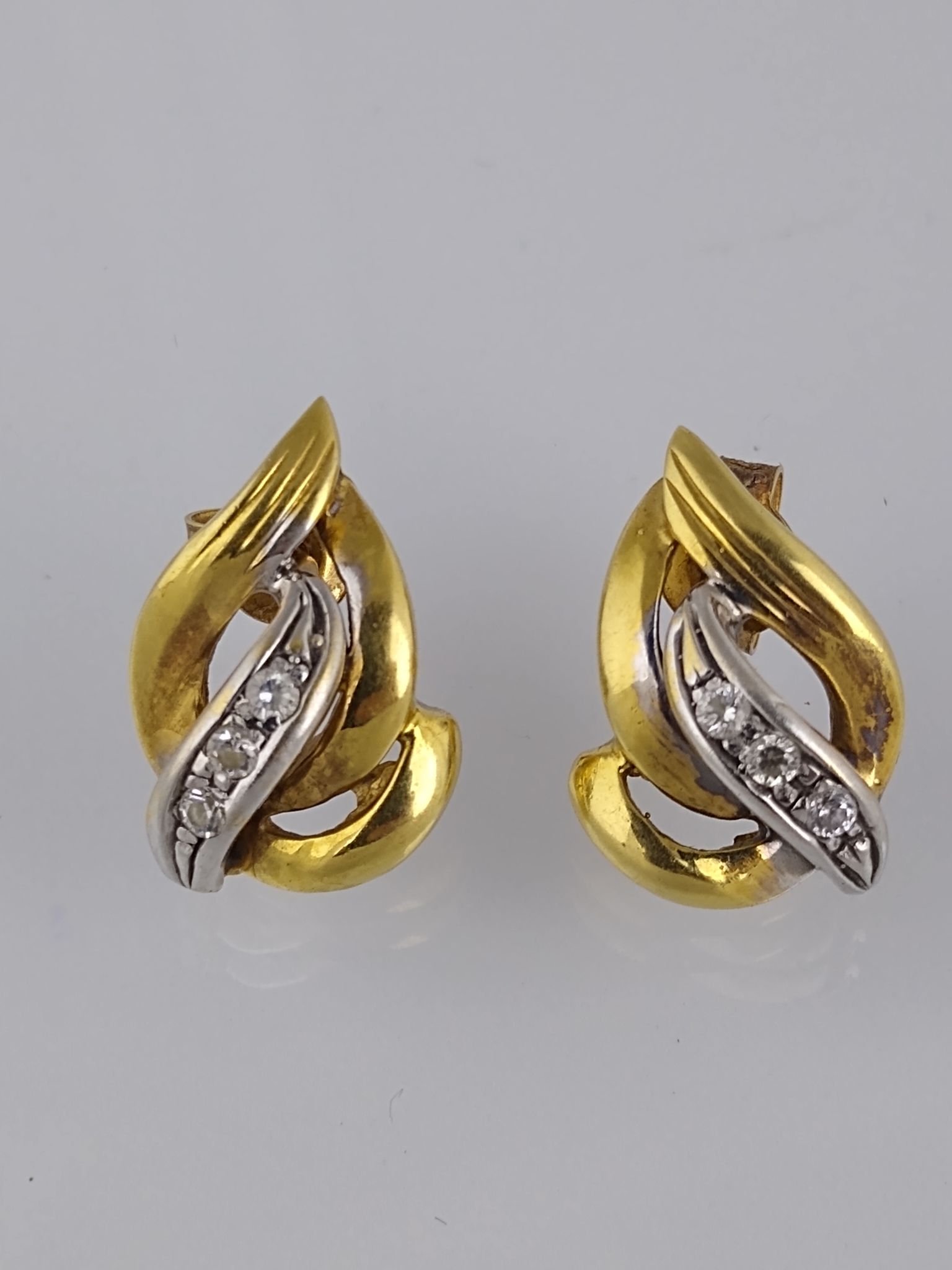 Par de caravanas tornillo en oro 18 K amarillo y blanco con tres pequeñas zirconias cada una. Peso bruto 5 gr.