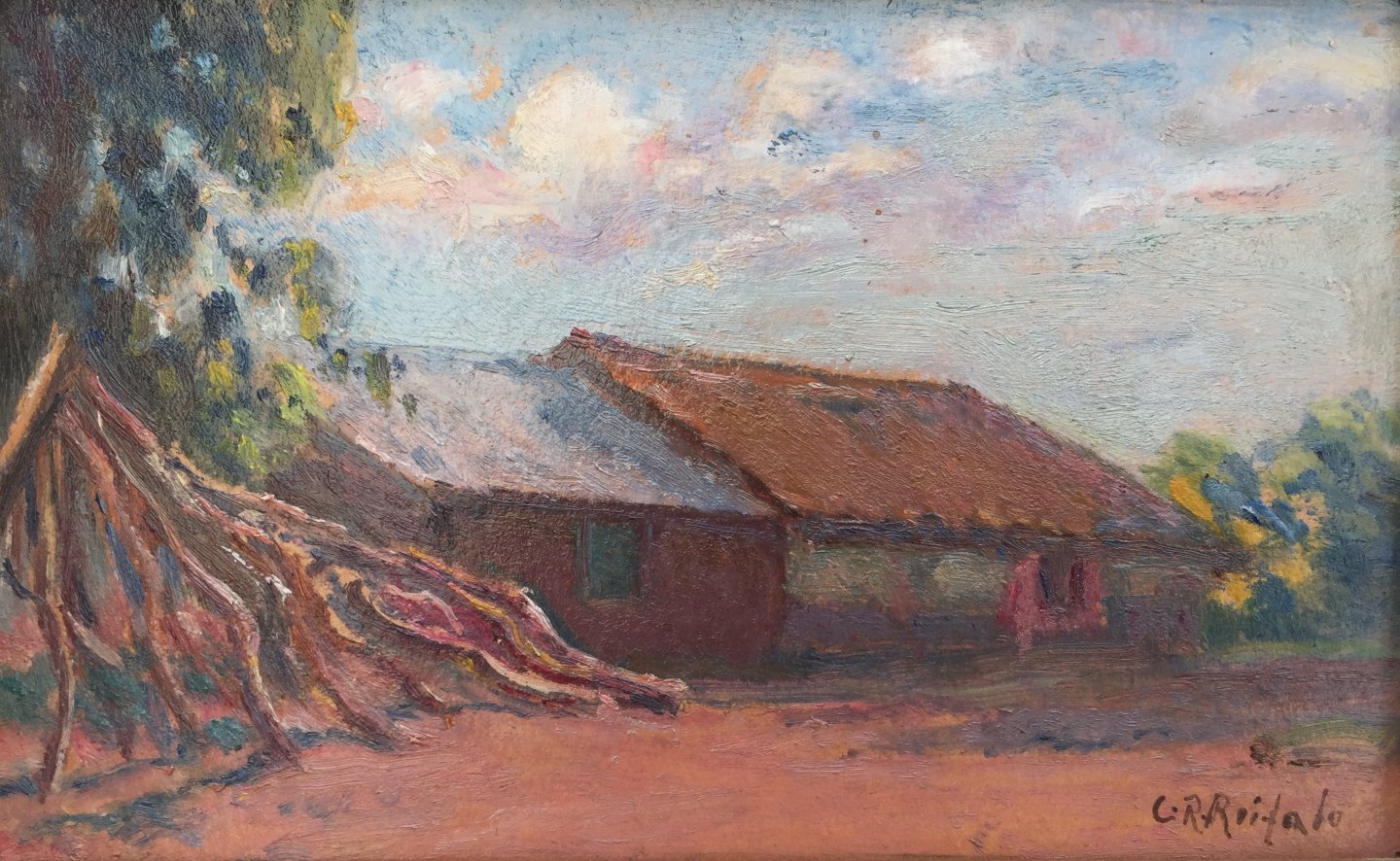 RUFALO, Carlos Roberto (escuela uruguaya, 1880-1975). Óleo sobre fibra. «Rancho.» Firmado abajo a la derecha. 15 x 23 cm