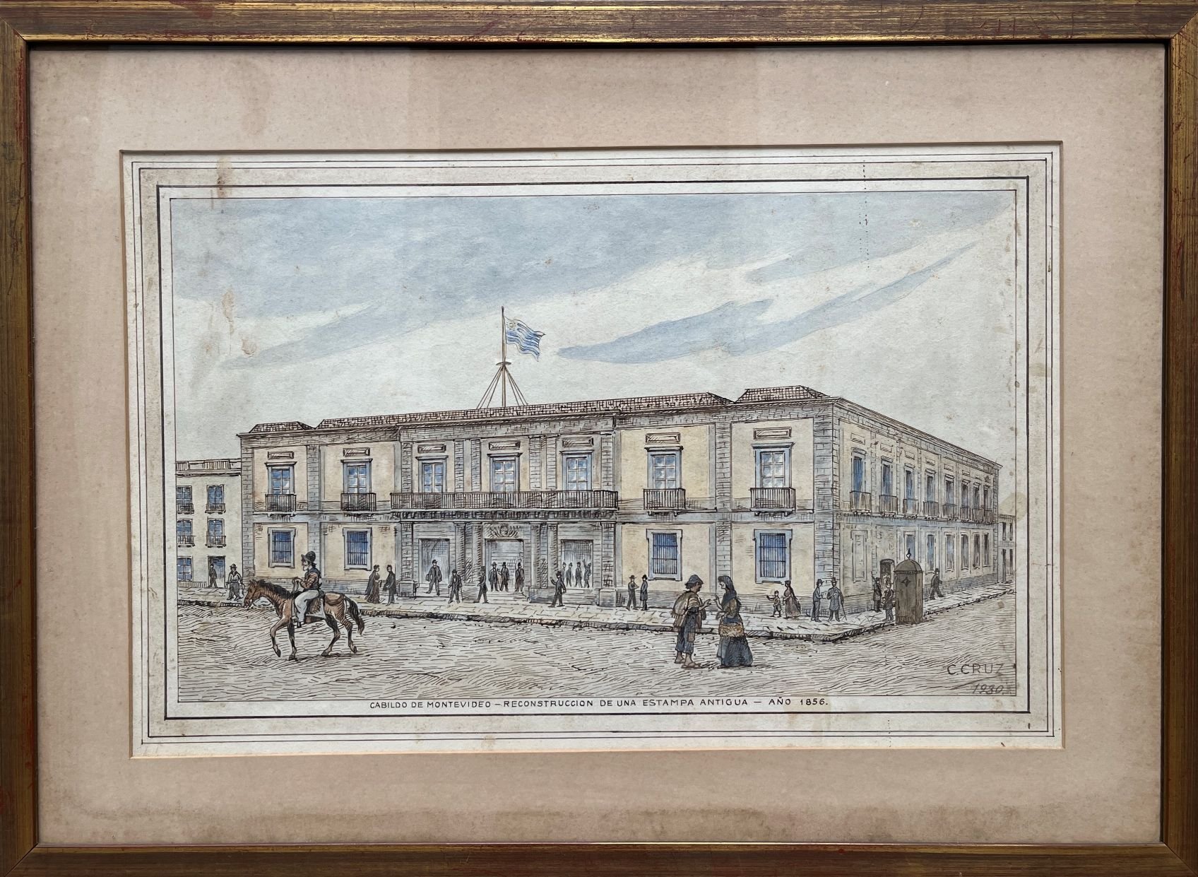 CARLOS CRUZ. Acuarela y tinta sobre papel. «Cabildo de Montevideo. Reconstrucción de una estampa antigua. 1856.» Firmado y fechado “1930” abajo a la derecha. 34 x 53 cm. Presenta manchas de humedad.