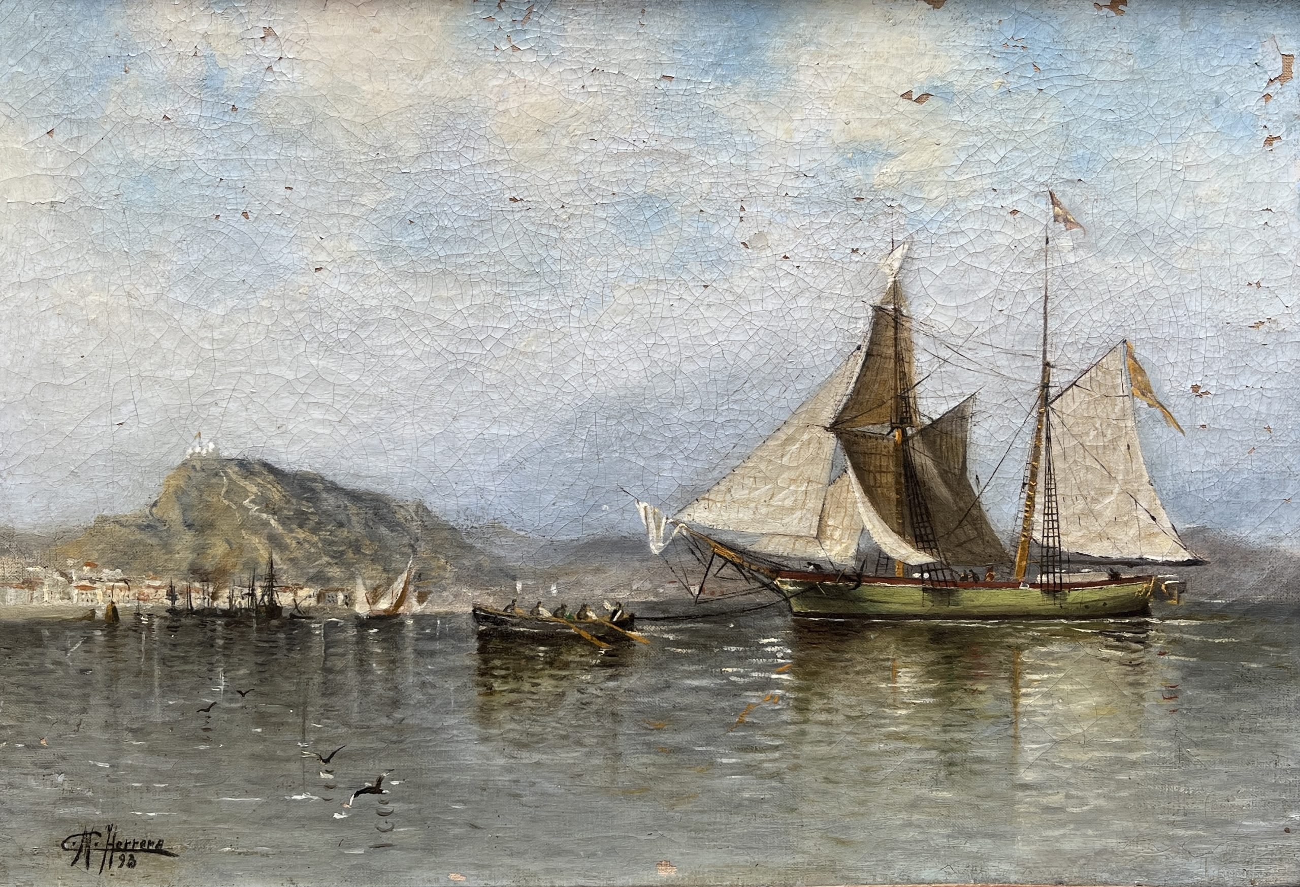 CARLOS MARÍA HERRERA (1875-1914) Óleo sobre tela. «Marina en Gibraltar» . Firmado y fechado «93» abajo a la izquierda . 31 x 45 cm. Presenta desprendimientos en óleo
