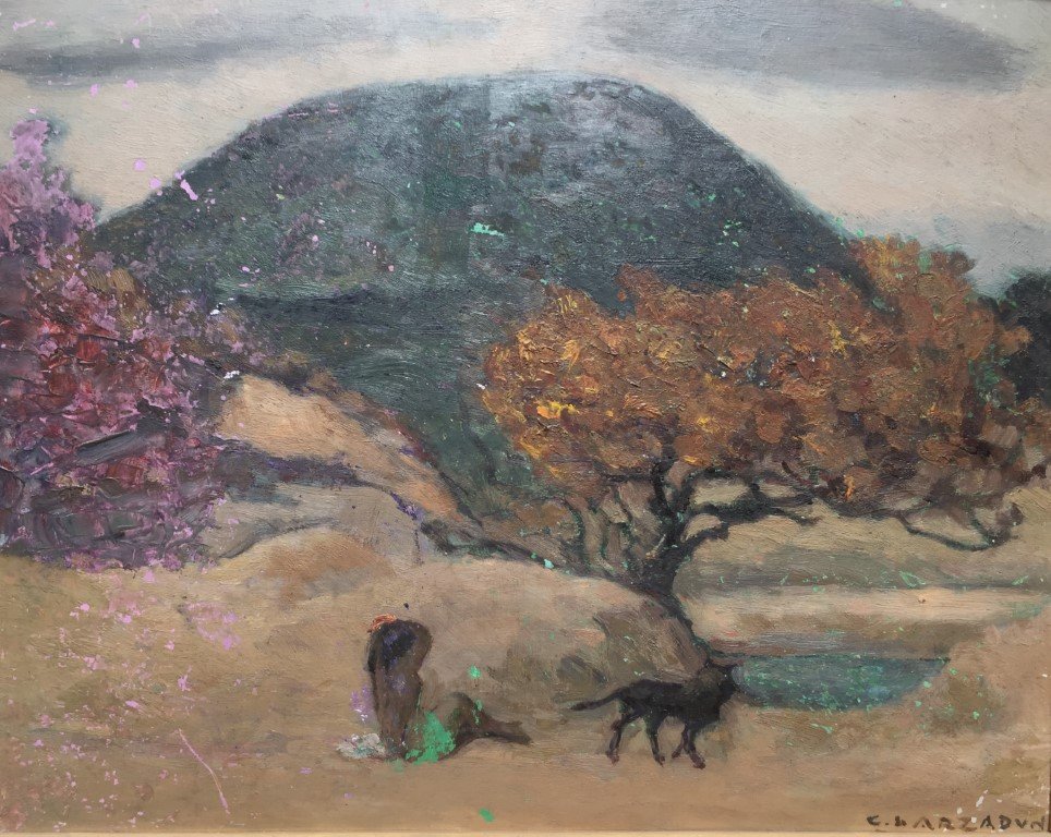 DE ARZADUN, Carmelo (escuela uruguaya, 1888-1968). Óleo sobre cartón. «Las Flores.» 36 x 45 cm. Desprendimientos en óleo.