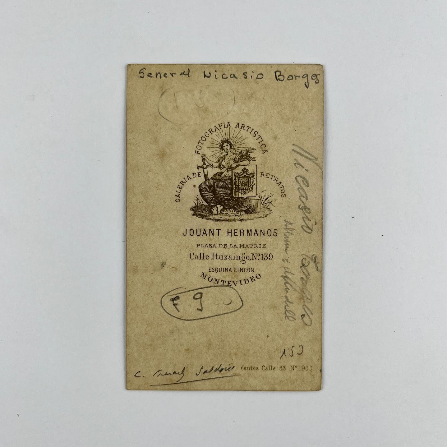 Carte de visite. “Gral. Nicasio Borges”, militar oriental y comandante de Paysandú, de larga afiliación en el Partido Colorado. Jouant Hermanos, Montevideo.