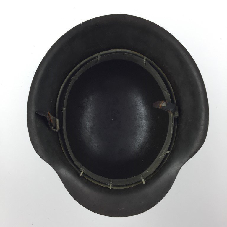 Casco alemán M42 en acero pintado color negro con insignias estampadas en laterales. Interior incompleto. WWII.