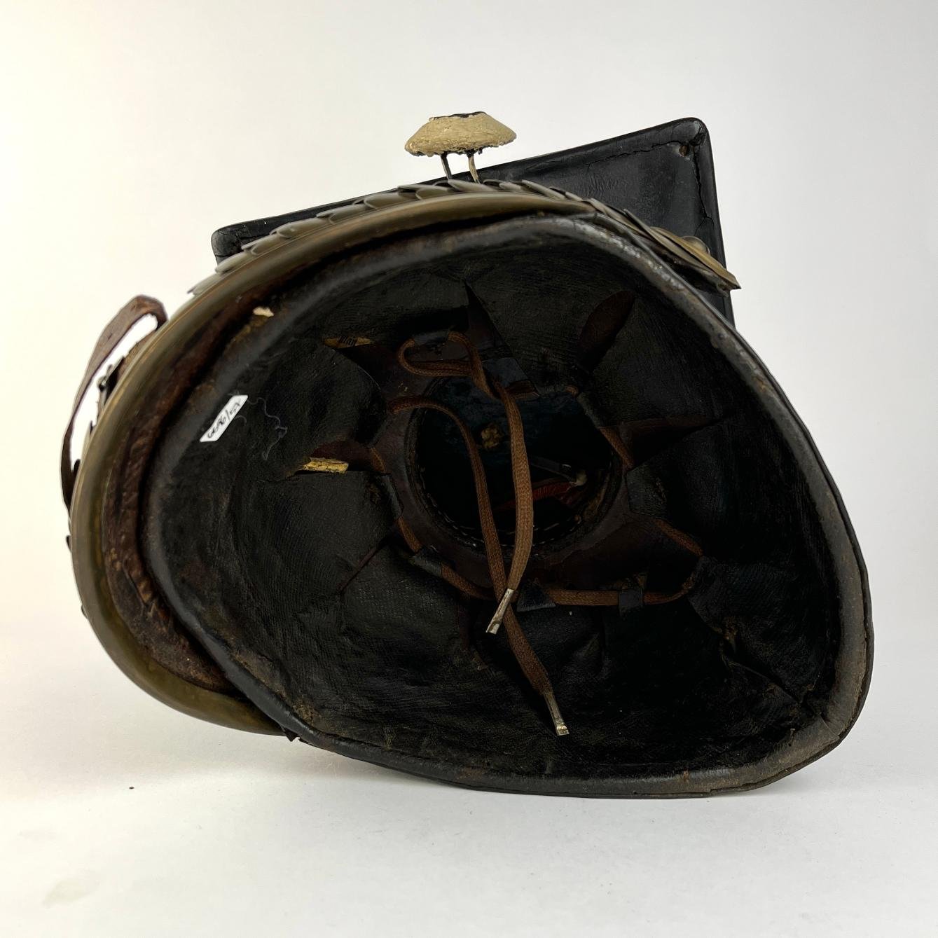 Casco de lancero de Regimiento Ulano, en cuero y bronce. Insignia frontal y carrilleras metálicas. Interior completo.