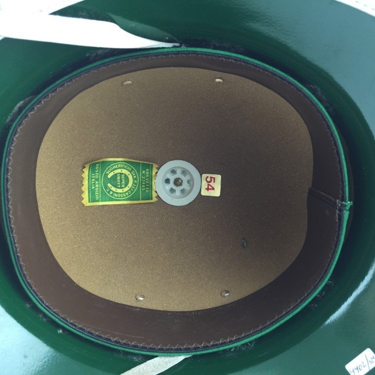 Casco en corcho pintado color blanco con insignia frontal de la policía de tránsito de la ciudad de Roma.