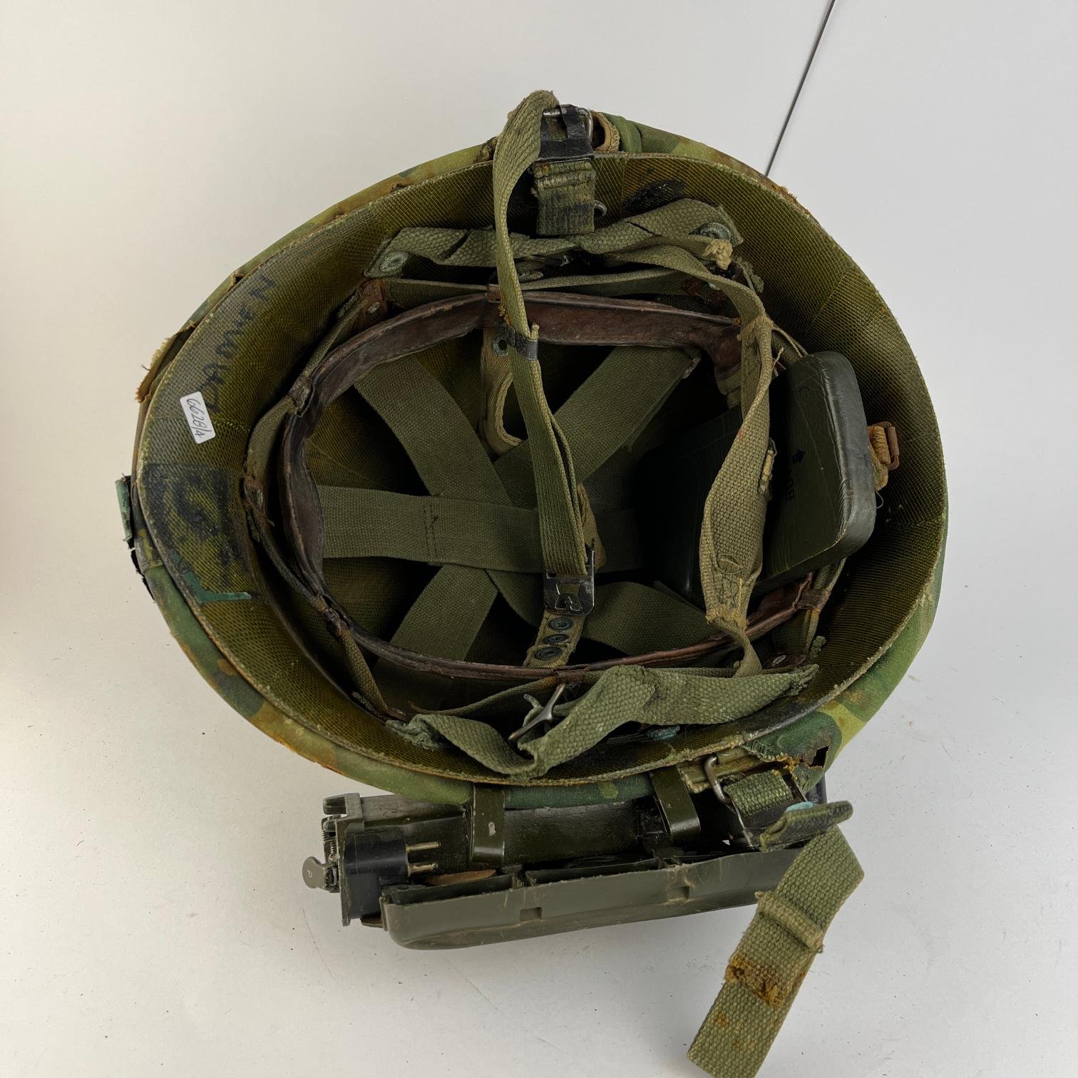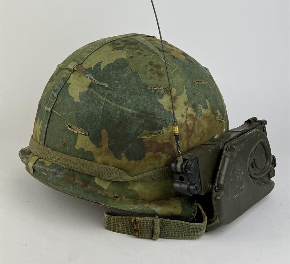 Casco estadounidense M1, con funda en tela camuflaje Mitchell, con radio PRR. Interior completo. Período guerra de Vietnam.
