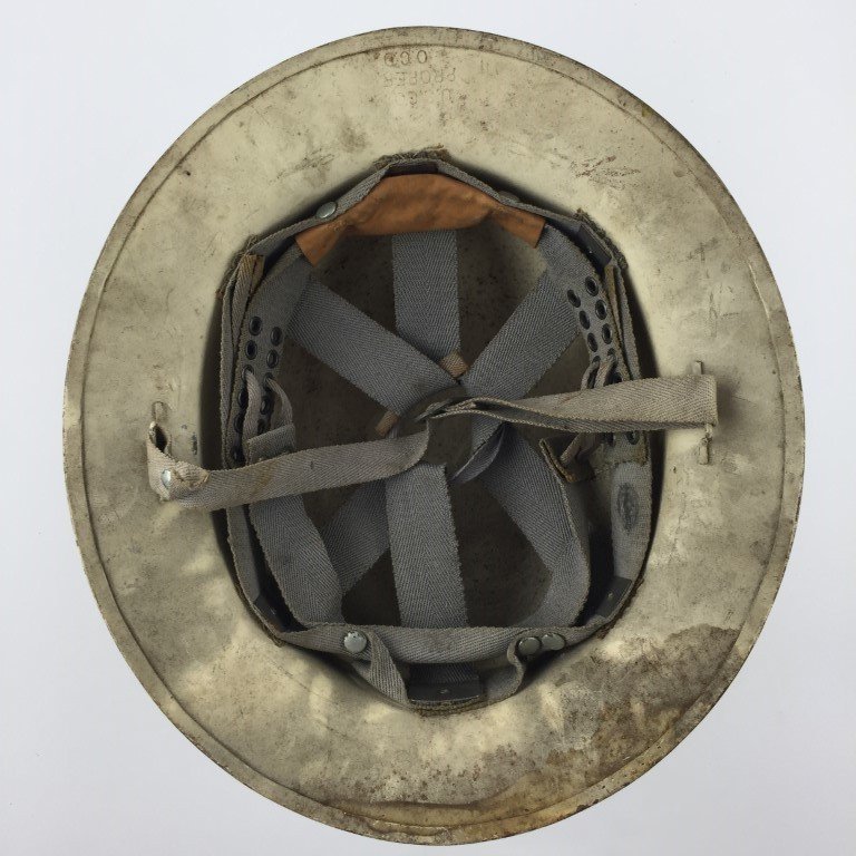 Casco estadounidense en acero pintado color blanco con restos de insignia frontal. Interior completo. Utilizado por la Defensa Civil, WWII.
