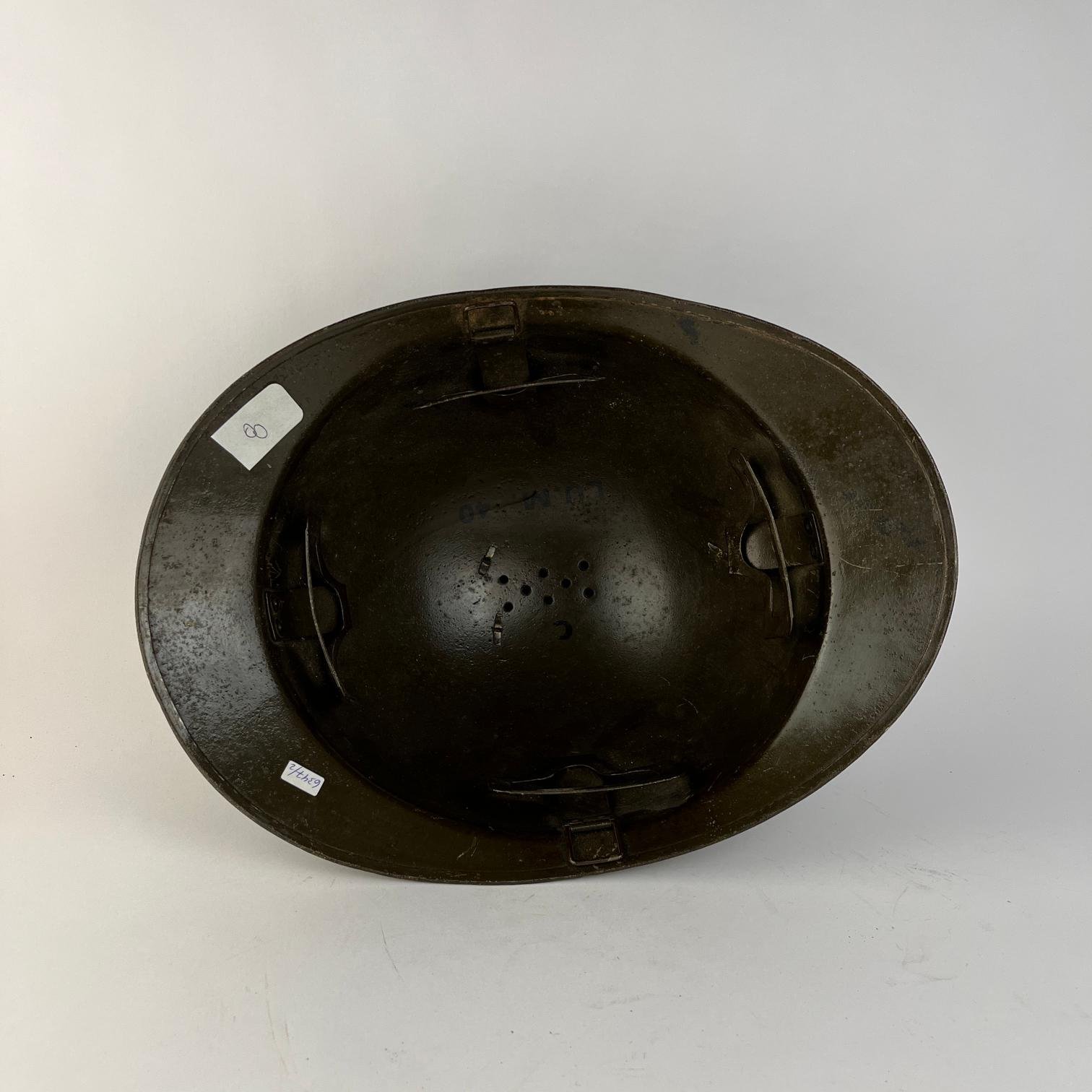 Casco francés Adrián de infantería, pintado color verde. Insignia frontal en cobre estampado, con monograma «R.F.».