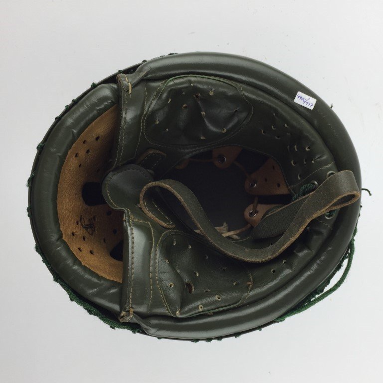 Casco militar polaco modelo WZ 1953 para paracaidista, en acero pintado color verde. Interior completo.