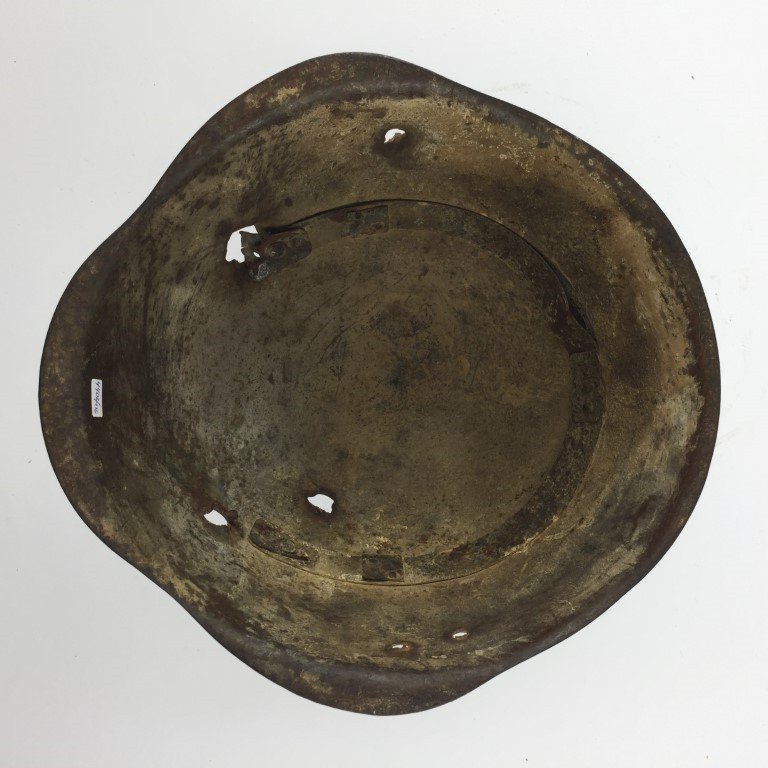 Casco militar polaco modelo WZ 1950 en acero pintado color verde. Con tres perforaciones de bala. Sin interior.