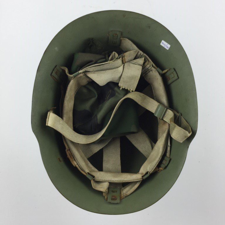 Casco militar yugoslavo en acero pintado color verde con insignia. Interior completo y funda de tela tipo «woodland».