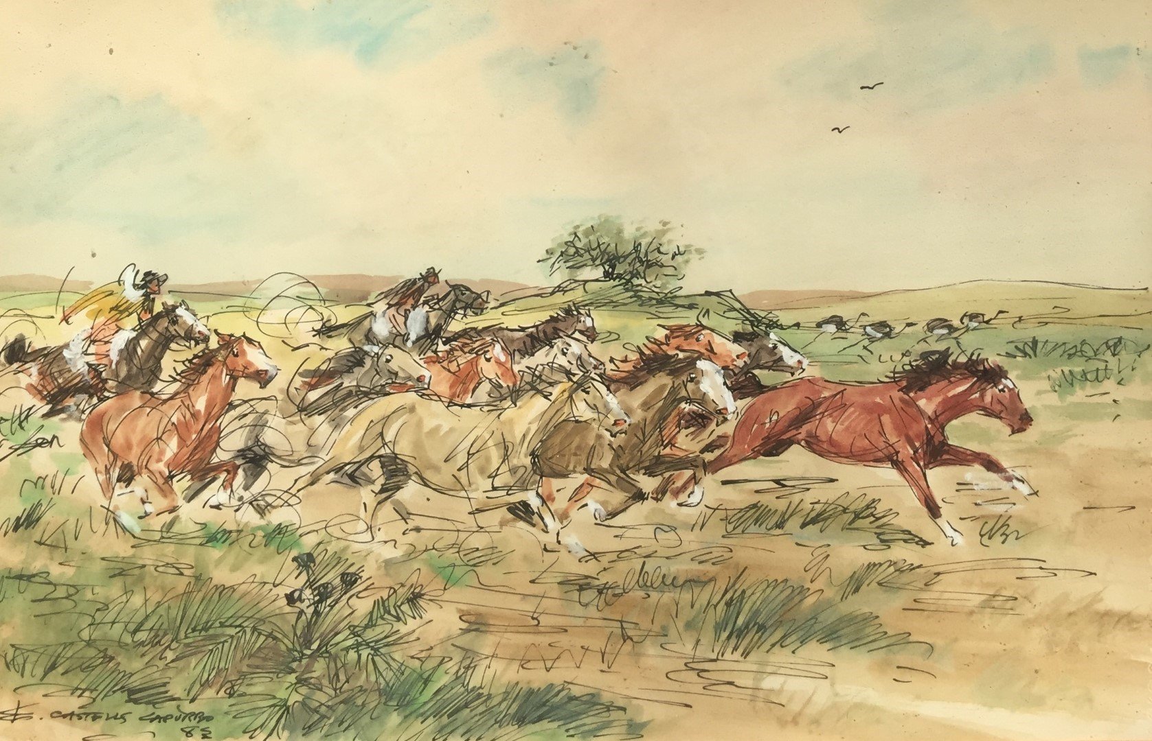 CASTELLS CAPURRO, Enrique (escuela uruguaya, 1913-1987). Acuarela sobre papel. «Tropeando.» Firmado y fechado «85» abajo a la izquierda. 37 x 56 cm.
