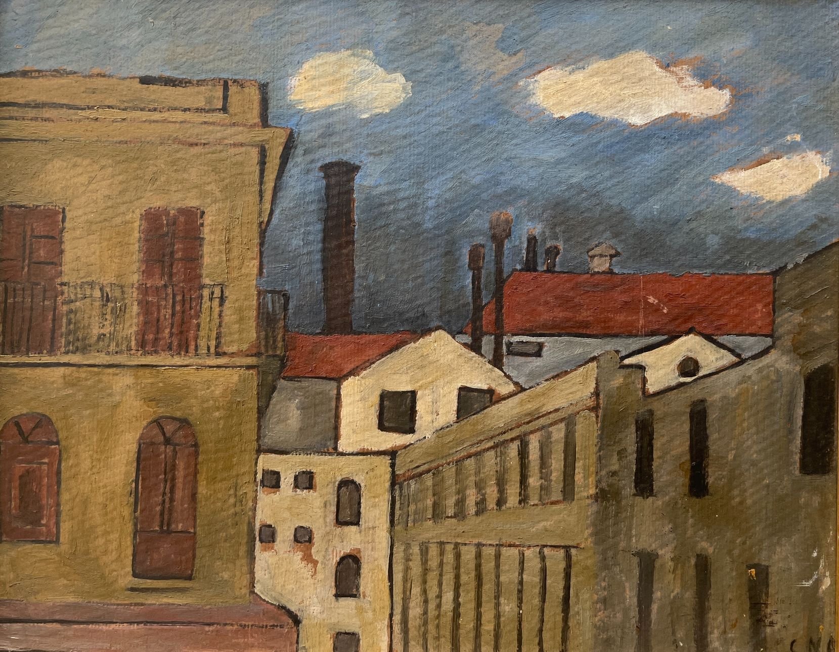 CELESTE NÚÑEZ (1918-2010) «Constructivo urbano» Óleo sobre fibra Firmado abajo a la derecha 39 x 49 cm